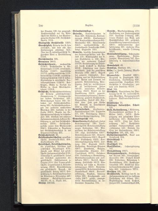 Gesellschaft, Gesellschaftswesen,die psychischen, sittlichen undrechtlichen Grundlagen 6/75:Zwecke nnd Mittel des gesell-schaftl.Zusammenschlusses 6/10;Litteratur 6: gesellschaitl. Tadelals sittliches Zuchtmittel 45;gesellschaftl. Institutionen u.Organe 61/4; vier Typen gesell-schaftl. Organisation d.Arbeits-teilung 360/2; Arbeitsteilung«in gesellschaftl. Prozeß, ihrgesellschaftl. Erfolg 363/5; Ent-wickelung d. Gesellschaftswesens !im Altertum u. Mittelalter 440;moderne Gesellschaftsformen441/53; G. u. Markt 501.