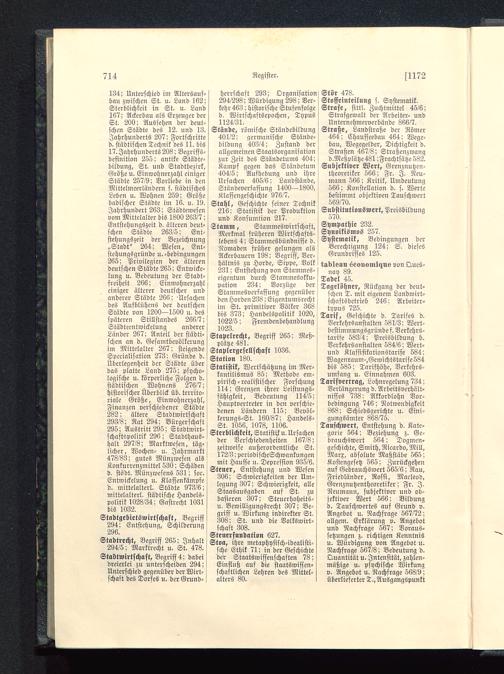 Stände, römische Ständebildung401/2: germanische Stttnde-bildung 403/4; Zustand derallgemeinen Staatsorganisationzur Zeit des Ständetums 404; jKampf gegen das Ständctum404/6; Äufhebung und ihreUrsachen 406/6; Landstände,Ständeverfassung 1400-1800,Klassengeschichte 976/7.Stahl, Geschichte seiner Technik216: Statistik der Produktionund Konsumtion 217.Stamm, Stammeswirtschaft,Merkmal früheren Wirtschafts-lebens 4; Stammesbündnisse d.Nomaden früher gelungen alsAckerbauern 198; Begriff, Ver-hältnis zu Horde, Sippe, Volk231; Entstehung von Stammes-eigentum durch Stammesokku-> pation 234; Vorzüge derj Stammesverfassung gegenüberden Horden 238; Eigentumsrecht^ im St. primitiver Völker 368bis 373; Handelspolitik 1020,1022/6; Fremdenbehandlung1023.