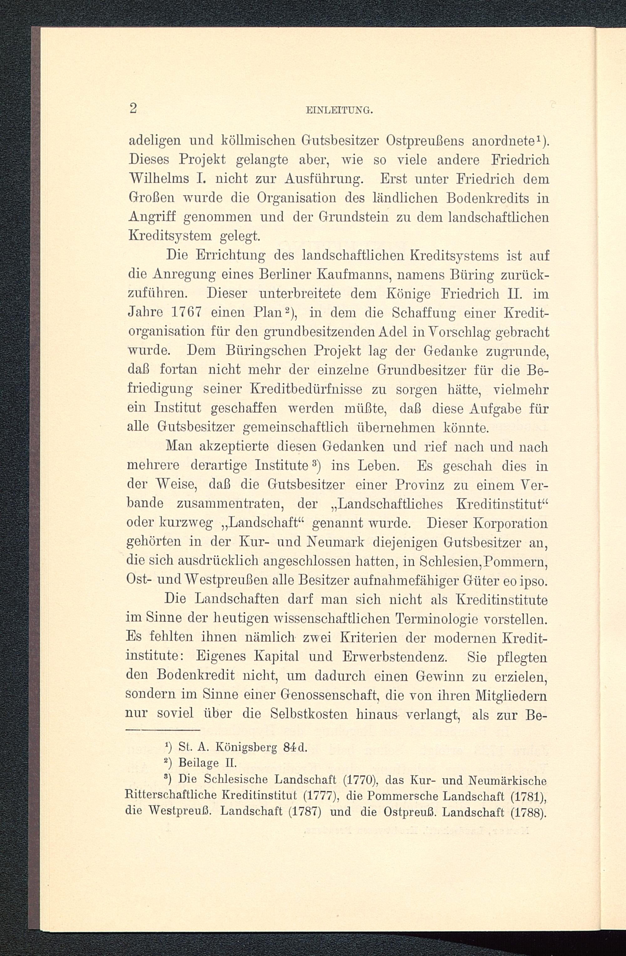 Die Errichtung des landschaftlichen Kreditsystems ist aufdie Anregung eines Berliner Kaufmanns, namens Büring zurück-zuführen. Dieser unterbreitete dem Könige Friedrich II. imJahre 1767 einen Plan 2 ), in dem die Schaffung einer Kredit-organisation für den grundbesitzenden Adel in Vorschlag gebrachtwurde. Dem Büringschen Projekt lag der Gedanke zugrunde,daß fortan nicht mehr der einzelne Grundbesitzer für die Be-friedigung seiner Kreditbedürfnisse zu sorgen hätte, vielmehrein Institut geschaffen werden müßte, daß diese Aufgabe füralle Gutsbesitzer gemeinschaftlich übernehmen könnte.