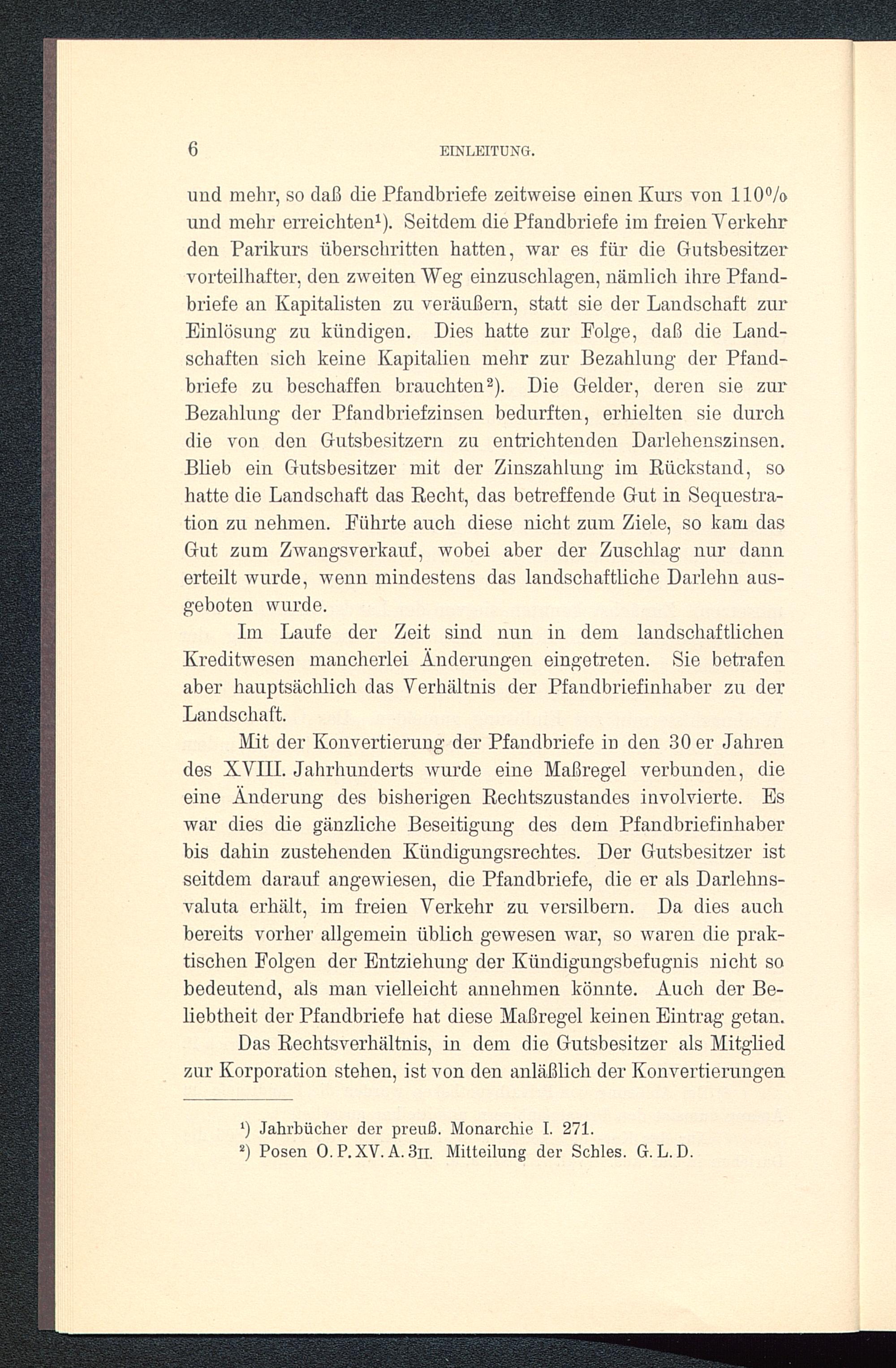 und mehr, so daß die Pfandbriefe zeitweise einen Kurs von 110%und mehr erreichten 1 ). Seitdem die Pfandbriefe im freien Verkehrden Parikurs überschritten hatten, war es für die Gutsbesitzervorteilhafter, den zweiten Weg einzuschlagen, nämlich ihre Pfand-briefe an Kapitalisten zu veräußern, statt sie der Landschaft zurEinlösung zu kündigen. Dies hatte zur Eolge, daß die Land-schaften sich keine Kapitalien mehr zur Bezahlung der Pfand-briefe zu beschaffen brauchten 2 ). Die Gelder, deren sie zurBezahlung der Pfandbriefzinsen bedurften, erhielten sie durchdie von den Gutsbesitzern zu entrichtenden Darlehenszinsen.Blieb ein Gutsbesitzer mit der Zinszahlung im Rückstand, sohatte die Landschaft das Recht, das betreffende Gut in Sequestra-tion zu nehmen. Führte auch diese nicht zum Ziele, so kam dasGut zum Zwangs verkauf, wobei aber der Zuschlag nur dannerteilt wurde, wenn mindestens das landschaftliche Darlehn aus-geboten wurde.