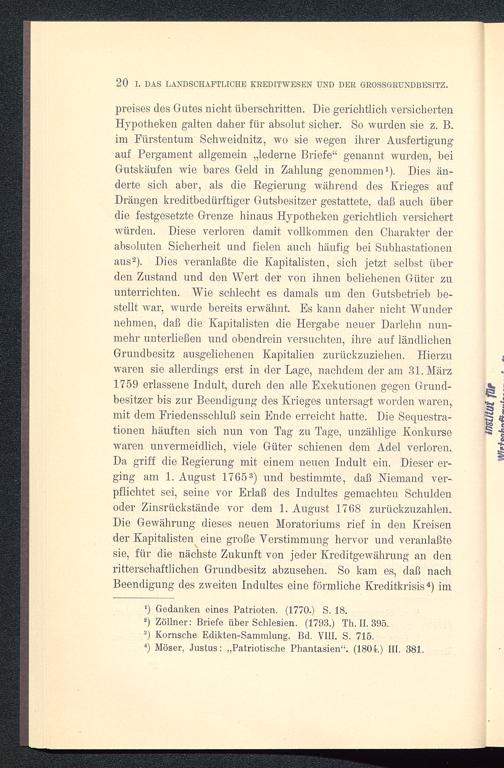preises des Gutes nicht überschritten. Die gerichtlich versichertenHypotheken galten daher für absolut sicher. So wurden sie z. B.im Fürstentum Schweidnitz, wo sie wegen ihrer Ausfertigungauf Pergament allgemein „lederne Briefe“ genannt wurden, beiGutskäufen wie bares Geld in Zahlung genommen 1 ). Dies än-derte sich aber, als die Regierung während des Krieges aufDrängen kreditbedürftiger Gutsbesitzer gestattete, daß auch überdie festgesetzte Grenze hinaus Hypotheken gerichtlich versichertwürden. Diese verloren damit vollkommen den Charakter derabsoluten Sicherheit und fielen auch häufig bei Subhastationenaus 2 ). Dies veranlaßt© die Kapitalisten, sich jetzt selbst überden Zustand und den Wert der von ihnen beliehenen Güter zuunterrichten. Wie schlecht es damals um den Gutsbetrieb be-stellt war, wurde bereits erwähnt. Es kann daher nicht Wundernehmen, daß die Kapitalisten die Hergabe neuer Darlehn nun-mehr unterließen und obendrein versuchten, ihre auf ländlichenGrundbesitz ausgeliehenen Kapitalien zurückzuziehen. Hierzuwaren sie allerdings erst in der Lage, nachdem der am 31. März1759 erlassene Indult, durch den alle Exekutionen gegen Grund-besitzer bis zur Beendigung des Krieges untersagt worden waren,,mit dem Friedensschluß sein Ende erreicht hatte. Die Sequestra-tionen häuften sich nun von Tag zu Tage, unzählige Konkursewaren unvermeidlich, viele Güter schienen dem Adel verloren.Da griff die Regierung mit einem neuen Indult ein. Dieser er-ging am 1. August 1765 3 ) und bestimmte, daß Niemand ver-pflichtet sei, seine vor Erlaß des Indultes gemachten Schuldenoder Zinsrückstände vor dem 1. August 1768 zurückzuzahlen.Die Gewährung dieses neuen Moratoriums rief in den Kreisender Kapitalisten eine große Verstimmung hervor und veranlaßtesie, für die nächste Zukunft von jeder Kreditgewährung an denritterschaftlichen Grundbesitz abzusehen. So kam es, daß nachBeendigung des zweiten Indultes eine förmliche Kreditkrisis 4 ) im