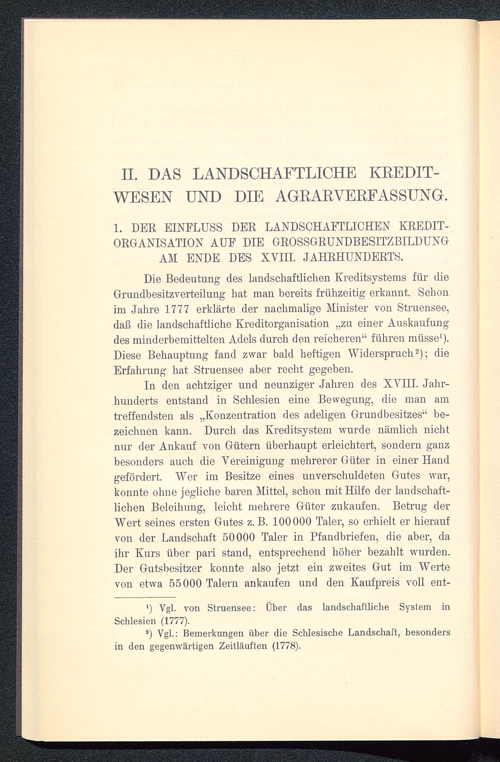 Die Bedeutung des landschaftlichen Kreditsystems für dieGrundbesitzverteilung hat man bereits frühzeitig erkannt. Schonim Jahre 1777 erklärte der nachmalige Minister von Struensee,daß die landschaftliche Kreditorganisation „zu einer Auskaufungdes minderbemittelten Adels durch den reicheren“ führen müsse 1 ).Diese Behauptung fand zwar bald heftigen Widerspruch 2 ); dieErfahrung hat Struensee aber recht gegeben.