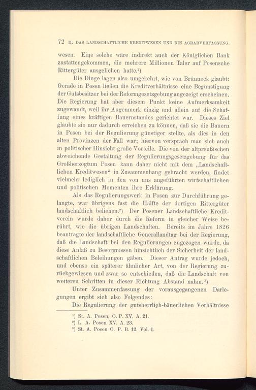 Die Dinge lagen also umgekehrt, wie von Brünneck glaubt:Gerade in Posen ließen die Kreditverhältnisse eine Begünstigungder Gutsbesitzer bei der Reformgesetzgebung angezeigt erscheinen.Die Regierung hat aber diesem Punkt keine Aufmerksamkeitzugewandt, weil ihr Augenmerk einzig und allein auf die Schaf-fung eines kräftigen Bauernstandes gerichtet war. Dieses Zielglaubte sie nur dadurch erreichen zu können, daß sie die Bauernin Posen bei der Regulierung günstiger stellte, als dies in denalten Provinzen der Pall war; hiervon versprach man sich auchin politischer Hinsicht große Vorteile. Die von der altpreußischenabweichende Gestaltung der Regulierungsgesetzgebung für dasGroßherzogtum Posen kann daher nicht mit dem „Landschaft-lichen Kreditwesen“ in Zusammenhang gebracht werden, findetvielmehr lediglich in den von uns angeführten wirtschaftlichenund politischen Momenten ihre Erklärung.