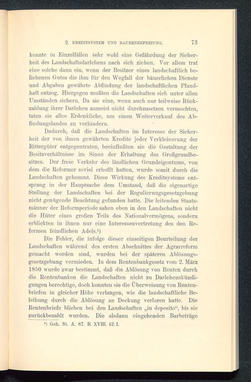 Die Fehler, die infolge dieser einseitigen Beurteilung derLandschaften während des ersten Abschnittes der Agrarreformgemacht worden sind, wurden bei der späteren Ablösungs-gesetzgebung vermieden. In dem Rentenbankgesetz vom 2. März1850 wurde zwar bestimmt, daß die Ablösung von Renten durchdie Rentenbanken die Landschaften nicht zu Darlehenskündi-gungen berechtige, doch konnten sie die Überweisung von Renten-briefen in gleicher Höhe verlangen, wie die landschaftliche Be-leihung durch die Ablösung an Deckung verloren hatte. DieRentenbriefe blieben bei den Landschaften „in deposito“, bis siezurückbezahlt wurden. Die alsdann eingehenden Barbeträge