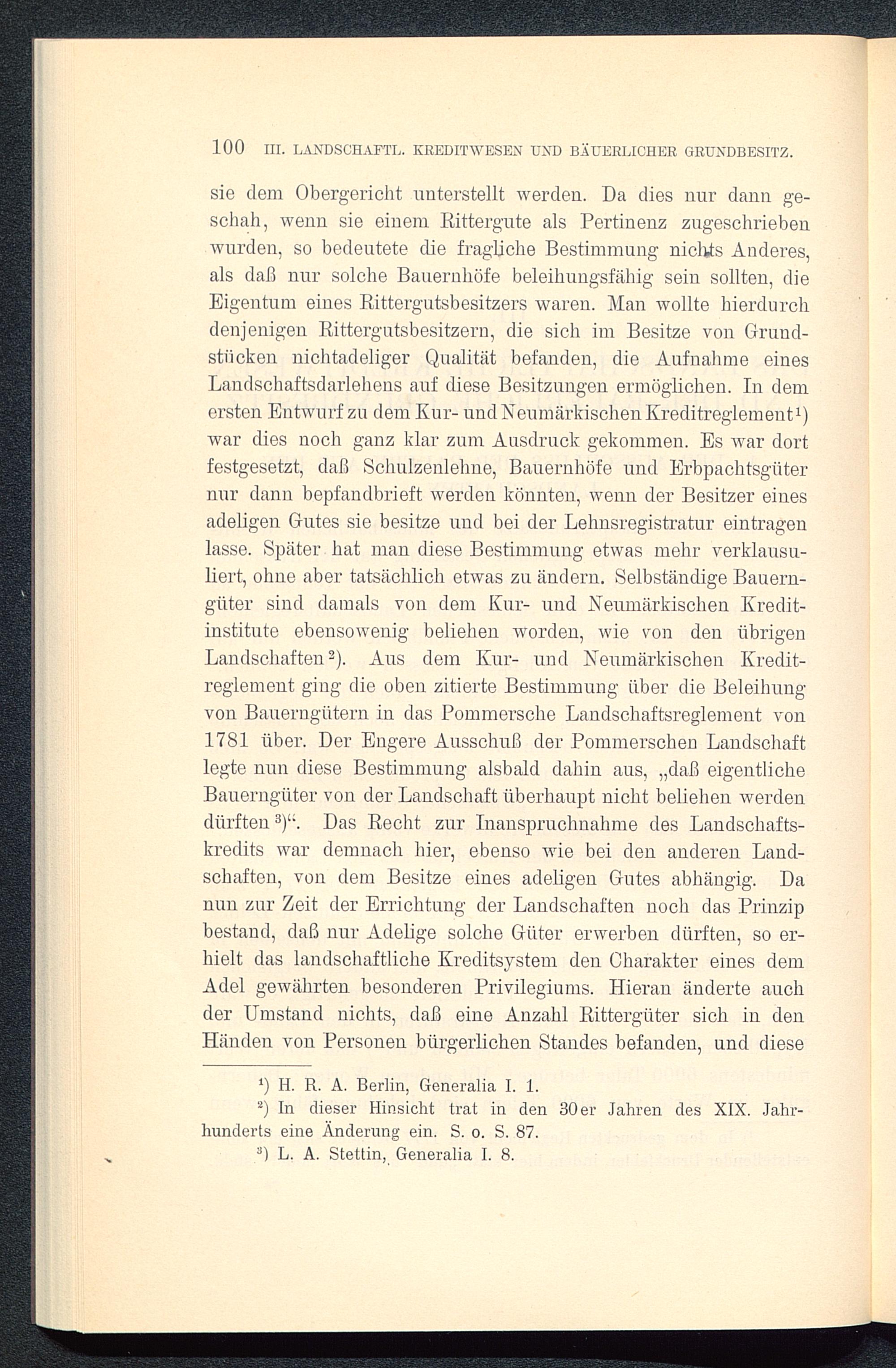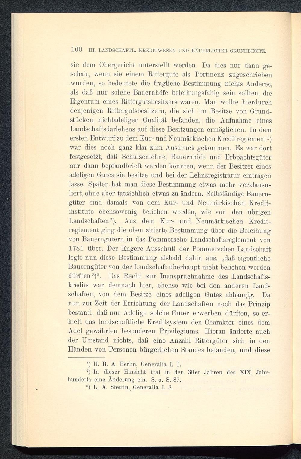 sie dem Obergericht unterstellt werden. Da dies nur dann ge-schah, wenn sie einem Rittergute als Pertinenz zugeschriebenwurden, so bedeutete die fragliche Bestimmung nichts Anderes,als daß nur solche Bauernhöfe beleihungsfähig sein sollten, dieEigentum eines Rittergutsbesitzers waren. Man wollte hierdurchdenjenigen Rittergutsbesitzern, die sich im Besitze von Grund-stücken nichtadeliger Qualität befanden, die Aufnahme einesLandschaftsdarlehens auf diese Besitzungen ermöglichen. In demersten Entwurf zu dem Kur- und Neumärkischen Kreditreglement 1 )war dies noch ganz klar zum Ausdruck gekommen. Es war dortfestgesetzt, daß Schulzenlehne, Bauernhöfe und Erbpachtsgüternur dann bepfandbrieft werden könnten, wenn der Besitzer einesadeligen Gutes sie besitze und bei der Lehnsregistratur eintragenlasse. Später hat man diese Bestimmung etwas mehr verklausu-liert, ohne aber tatsächlich etwas zu ändern. Selbständige Bauern-güter sind damals von dem Kur- und Neumärkischen Kredit-institute ebensowenig belieben worden, wie von den übrigenLandschaften 2 ). Aus dem Kur- und Neumärkischen Kredit-reglement ging die oben zitierte Bestimmung über die Beleihungvon Bauerngütern in das Pommei’sche Landschaftsreglement von1781 über. Der Engere Ausschuß der Pommerscheu Landschaftlegte nun diese Bestimmung alsbald dahin aus, „daß eigentlicheBauerngüter von der Landschaft überhaupt nicht beliehen werdendürften 3 ) u . Das Recht zur Inanspruchnahme des Landschafts-kredits war demnach hier, ebenso Avie bei den anderen Land-schaften, von dem Besitze eines adeligen Gutes abhängig. Danun zur Zeit der Errichtung der Landschaften noch das Prinzipbestand, daß nur Adelige solche Güter erwerben dürften, so er-hielt das landschaftliche Kreditsystem den Charakter eines demAdel gewährten besonderen Privilegiums. Hieran änderte auchder Umstand nichts, daß eine Anzahl Rittergüter sich in denHänden von Personen bürgerlichen Standes befanden, und diese