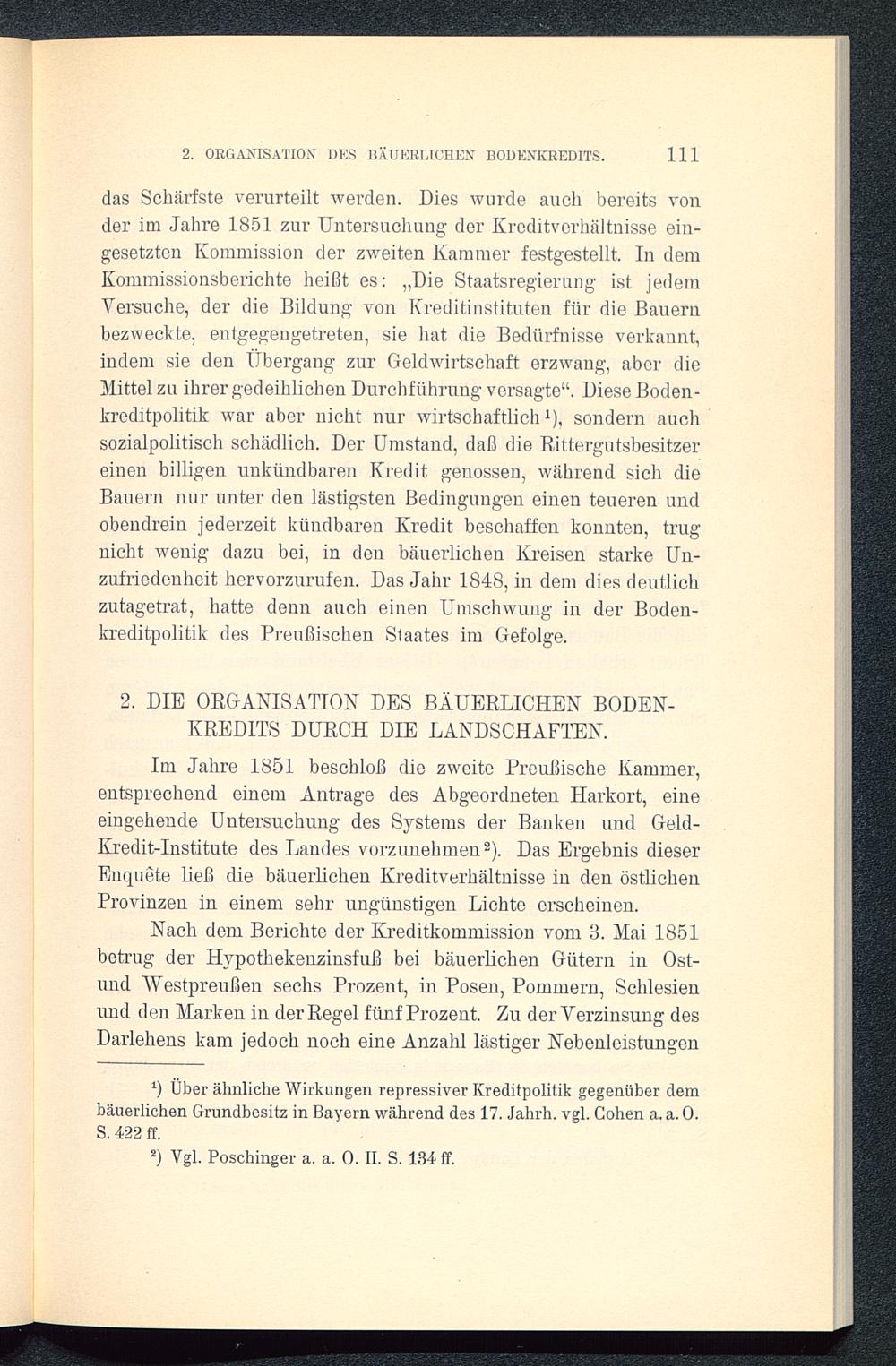 das Schärfste verurteilt werden. Dies wurde auch bereits vonder im Jahre 1851 zur Untersuchung der Kreditverhältnisse ein-gesetzten Kommission der zweiten Kammer festgestellt. In demKommissionsberichte heißt es: „Die Staatsregierung ist jedemVersuche, der die Bildung von Kreditinstituten für die Bauernbezweckte, entgegengetreten, sie hat die Bedürfnisse verkannt,indem sie den Übergang zur Geldwirtschaft erzwang, aber dieMittel zu ihrer gedeihlichen Durchführung versagte“. Diese Boden-kreditpolitik war aber nicht nur wirtschaftlich 1 ), sondern auchsozialpolitisch schädlich. Der Umstand, daß die Rittergutsbesitzereinen billigen unkündbaren Kredit genossen, während sich dieBauern nur unter den lästigsten Bedingungen einen teueren undobendrein jederzeit kündbaren Kredit beschaffen konnten, trugnicht wenig dazu bei, in den bäuerlichen Kreisen starke Un-zufriedenheit hervorzurufen. Das Jahr 1848, in dem dies deutlichzutagetrat, hatte denn auch einen Umschwung in der Boden-kreditpolitik des Preußischen Staates im Gefolge.