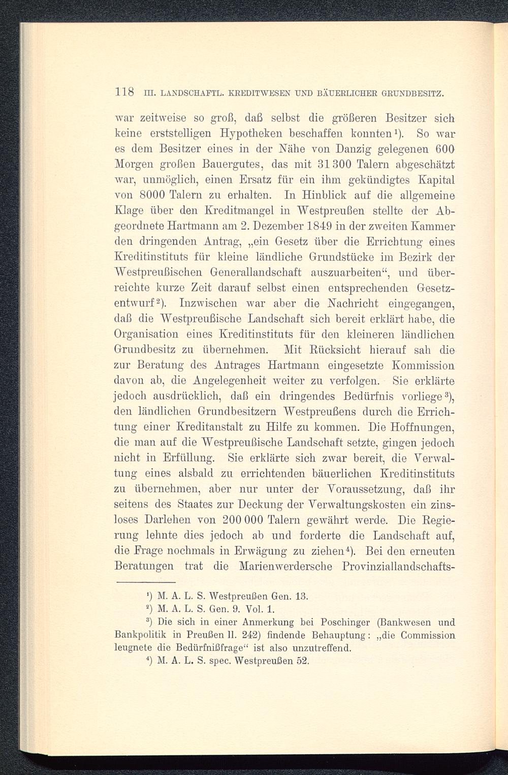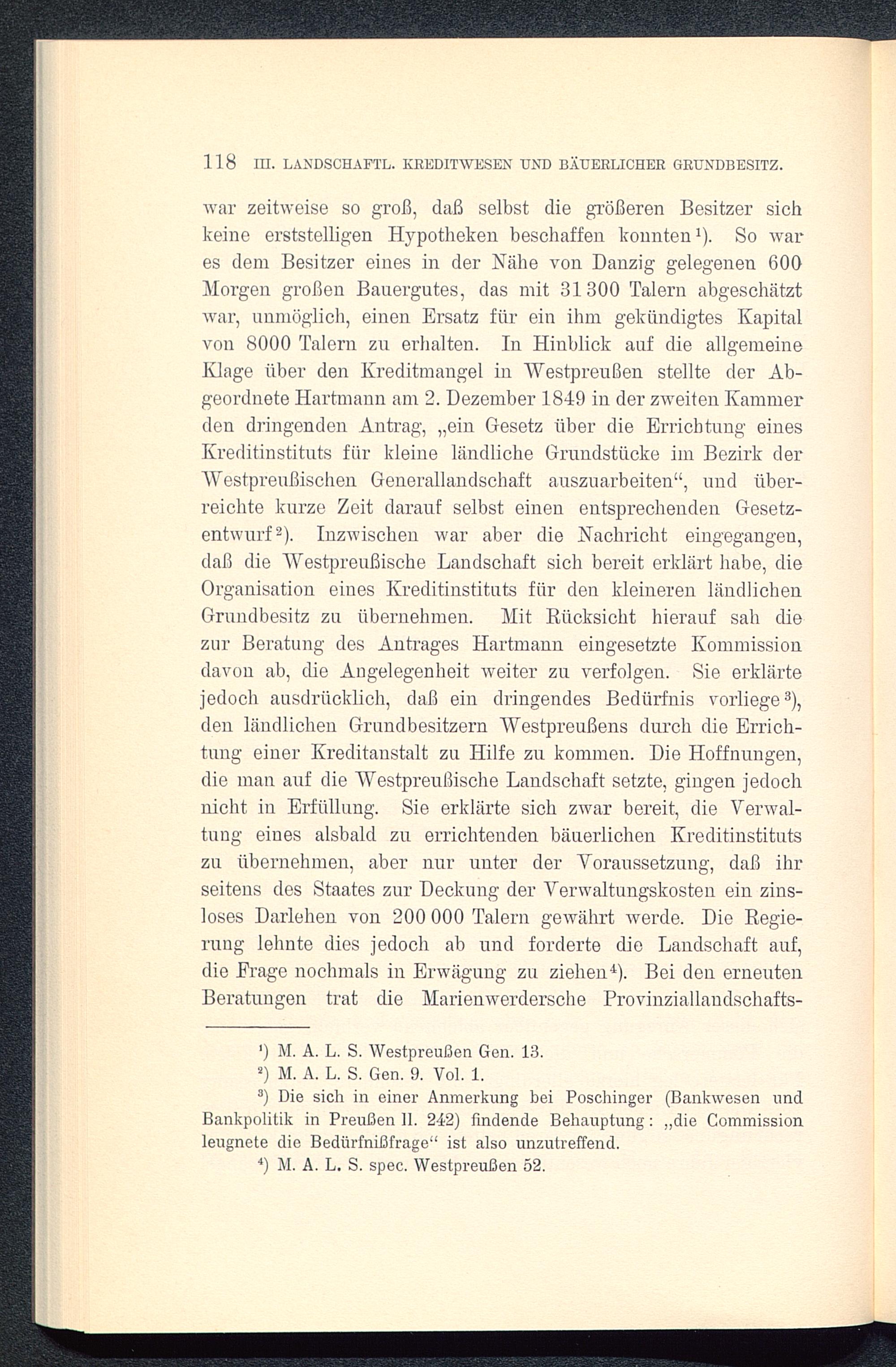 war zeitweise so groß, daß selbst die größeren Besitzer sichkeine erststelligen Hypotheken beschaffen konnten 1 ). So wares dein Besitzer eines in der Nähe von Danzig gelegenen 600Morgen großen Bauergutes, das mit 31300 Talern abgeschätztwar, unmöglich, einen Ersatz für ein ihm gekündigtes Kapitalvon 8000 Talern zu erhalten. In Hinblick auf die allgemeineKlage über den Kreditmangel in Westpreußen stellte der Ab-geordnete Hartmann am 2. Dezember 1849 in der zweiten Kammerden dringenden Antrag, „ein Gesetz über die Errichtung einesKreditinstituts für kleine ländliche Grundstücke im Bezirk derWestpreußischen Generallandschaft auszuarbeiten“, und über-reichte kurze Zeit darauf selbst einen entsprechenden Gesetz-entwurf 2 ). Inzwischen war aber die Nachricht eingegangen,daß die Westpreußische Landschaft sich bereit erklärt habe, dieOrganisation eines Kreditinstituts für den kleineren ländlichenGrundbesitz zu übernehmen. Mit Rücksicht hierauf sah diezur Beratung des Antrages Hartmann eingesetzte Kommissiondavon ab, die Angelegenheit weiter zu verfolgen. Sie erklärtejedoch ausdrücklich, daß ein dringendes Bedürfnis vorliege 3 ),den ländlichen Grundbesitzern Westpreußens durch die Errich-tung einer Kreditanstalt zu Hilfe zu kommen. Die Hoffnungen,die man auf die Westpreußische Landschaft setzte, gingen jedochnicht in Erfüllung. Sie erklärte sich zwar bereit, die Verwal-tung eines alsbald zu errichtenden bäuerlichen Kreditinstitutszu übernehmen, aber nur unter der Voraussetzung, daß ihrseitens des Staates zur Deckung der Verwaltungskosten ein zins-loses Darlehen von 200 000 Talern gewährt werde. Die Regie-rung lehnte dies jedoch ab und forderte die Landschaft auf,die Frage nochmals in Erwägung zu ziehen 4 ). Bei den erneutenBeratungen trat die Marienwerdersche Provinziallandschafts-