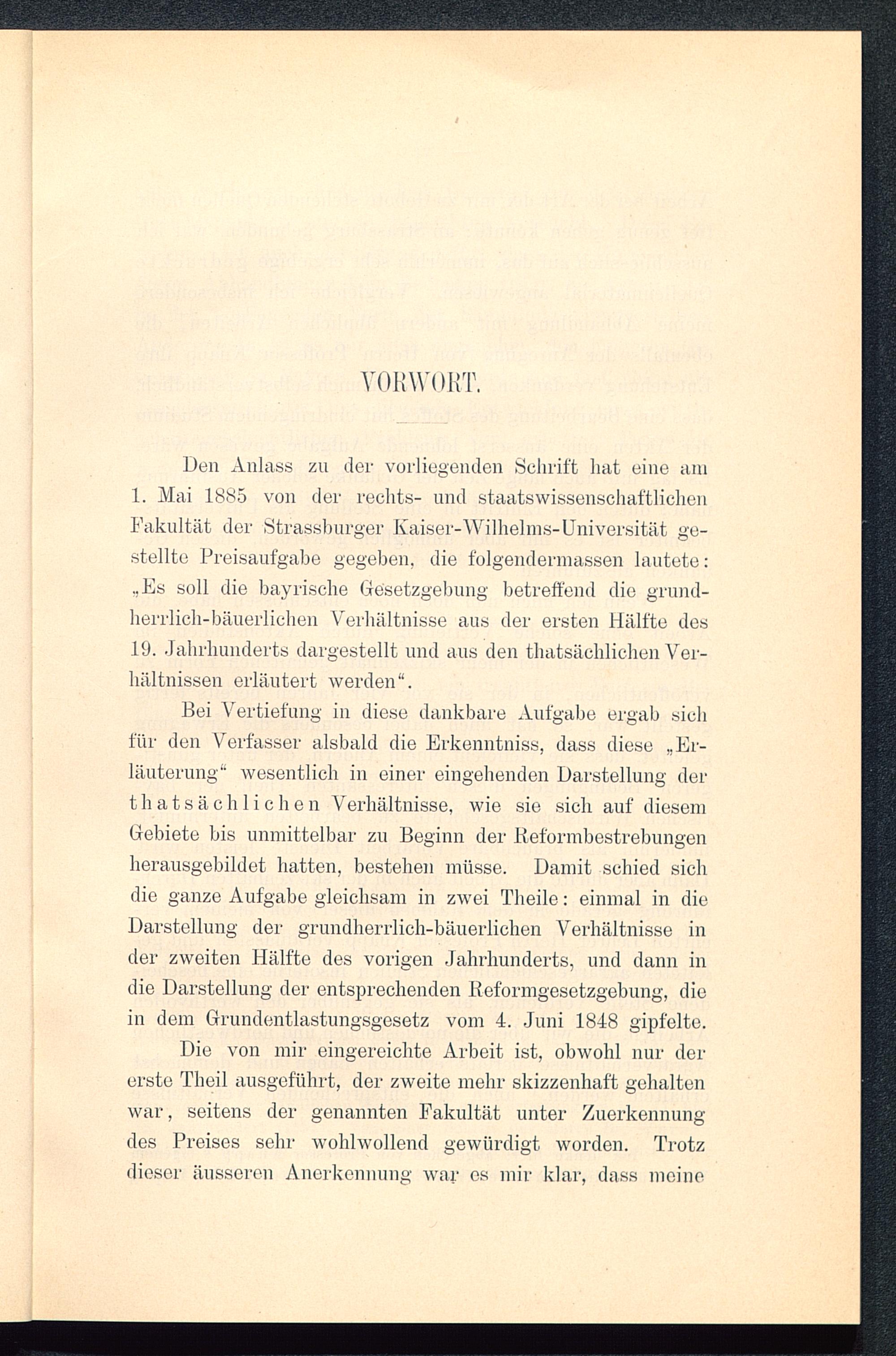 Den Anlass zu der vorliegenden Schrift hat eine am1. Mai 1885 von der rechts- und staatswissenschaftlichenFakultät der Strassburger Kaiser-Wilhelms-Universität ge-stellte Freisaufgabe gegeben, die folgendermassen lautete:,Es soll die bayrische Gesetzgebung betreffend die grund-herrlich-bäuerlichen Verhältnisse aus der ersten Hälfte des19. Jahrhunderts dargestellt und aus den thatsächlichen Ver-hältnissen erläutert werden“.