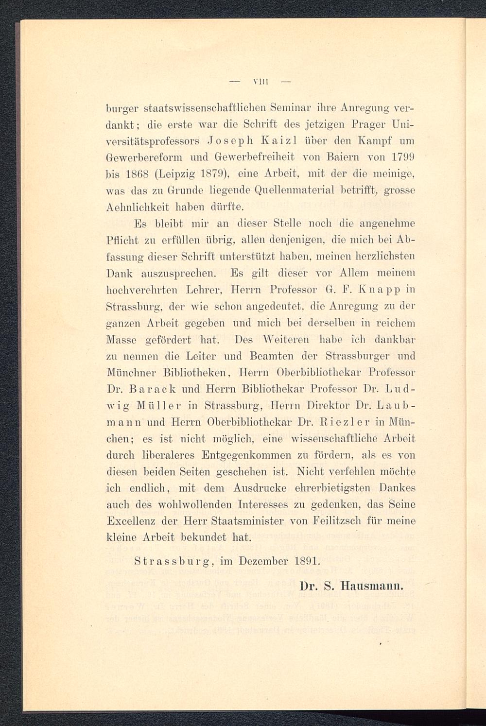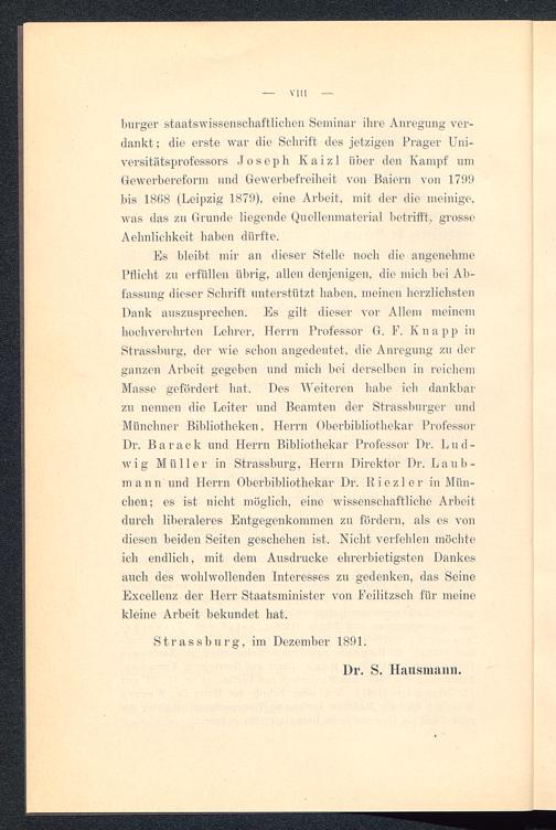 Es bleibt mir an dieser Stelle noch die angenehmePflicht zu erfüllen übrig, allen denjenigen, die mich bei Ab-fassung dieser Schrift unterstützt haben, meinen herzlichstenDank auszusprechen. Es gilt dieser vor Allem meinemhochverehrten Lehrer, Herrn Professor G. F. K n a p p inStrassburg, der wie schon angedeutet, die Anregung zu derganzen Arbeit gegeben und mich bei derselben in reichemMasse gefördert hat. Des Weiteren habe ich dankbarzu nennen die Leiter und Beamten der Strassburger undMünchner Bibliotheken, Herrn Oberbibliothekar ProfessorDr. Barack und Herrn Bibliothekar Professor Dr. Lud-wig Müller in Strassburg , Herrn Direktor Dr. Laub-mann und Herrn Oberbibliothekar Dr. Riezler in Mün-chen ; es ist nicht möglich, eine wissenschaftliche Arbeitdurch liberaleres Entgegenkommen zu fördern, als es vondiesen beiden Seiten geschehen ist. Nicht verfehlen möchteich endlich, mit dem Ausdrucke ehrerbietigsten Dankesauch des wohlwollenden Interesses zu gedenken, das SeineExcellenz der Herr Staatsminister von Feilitzsch für meinekleine Arbeit bekundet hat.