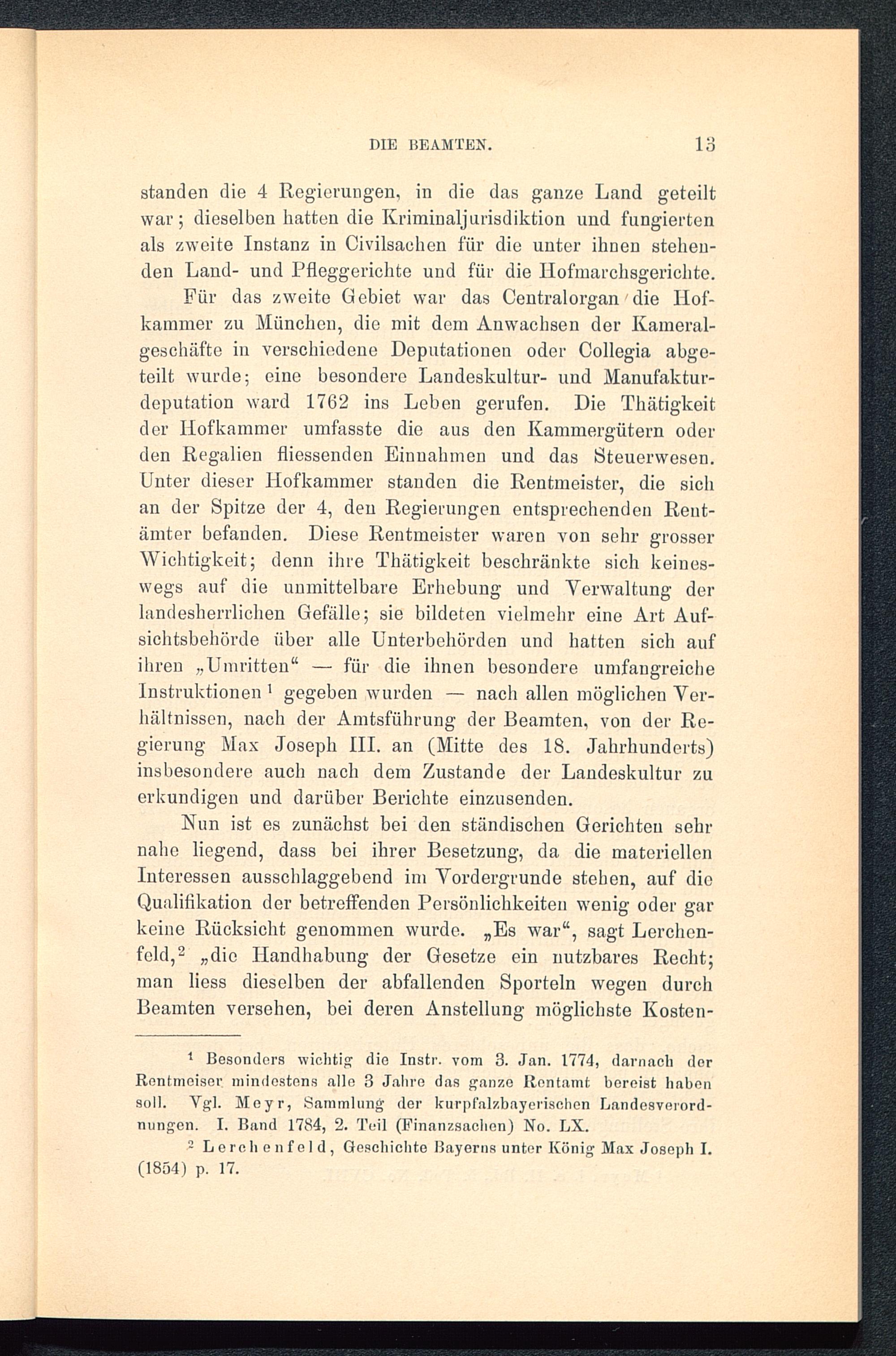 Für das zweite Gebiet war das Centralorgan' die Ilof-kammer zu München , die mit dem Anwachsen der Kameral-geschäfte in verschiedene Deputationen oder Collegia abge-teilt wurde; eine besondere Landeskultur- und Manufaktur-deputation ward 1762 ins Leben gerufen. Die Thätigkeitder Hofkammer umfasste die aus den Kammergütern oderden Regalien fliessenden Einnahmen und das Steuerwesen.Unter dieser Hofkammer standen die Rentmeister , die sichan der Spitze der 4, den Regierungen entsprechenden Rent-ämter befanden. Diese Rentmeister waren von sehr grosserWichtigkeit; denn ihre Thätigkeit beschränkte sich keines-wegs auf die unmittelbare Erhebung und Verwaltung derlandesherrlichen Gefälle; sie bildeten vielmehr eine Art Auf-sichtsbehörde über alle Unterbchörden und hatten sich aufihren „Umritten“ — für die ihnen besondere umfangreicheInstruktionen 1 gegeben wurden — nach allen möglichen Ver-hältnissen, nach der Amtsführung der Beamten, von der Re-gierung Max Joseph III. an (Mitte des 18. Jahrhunderts)insbesondere auch nach dem Zustande der Landeskultur zuerkundigen und darüber Berichte einzusenden.