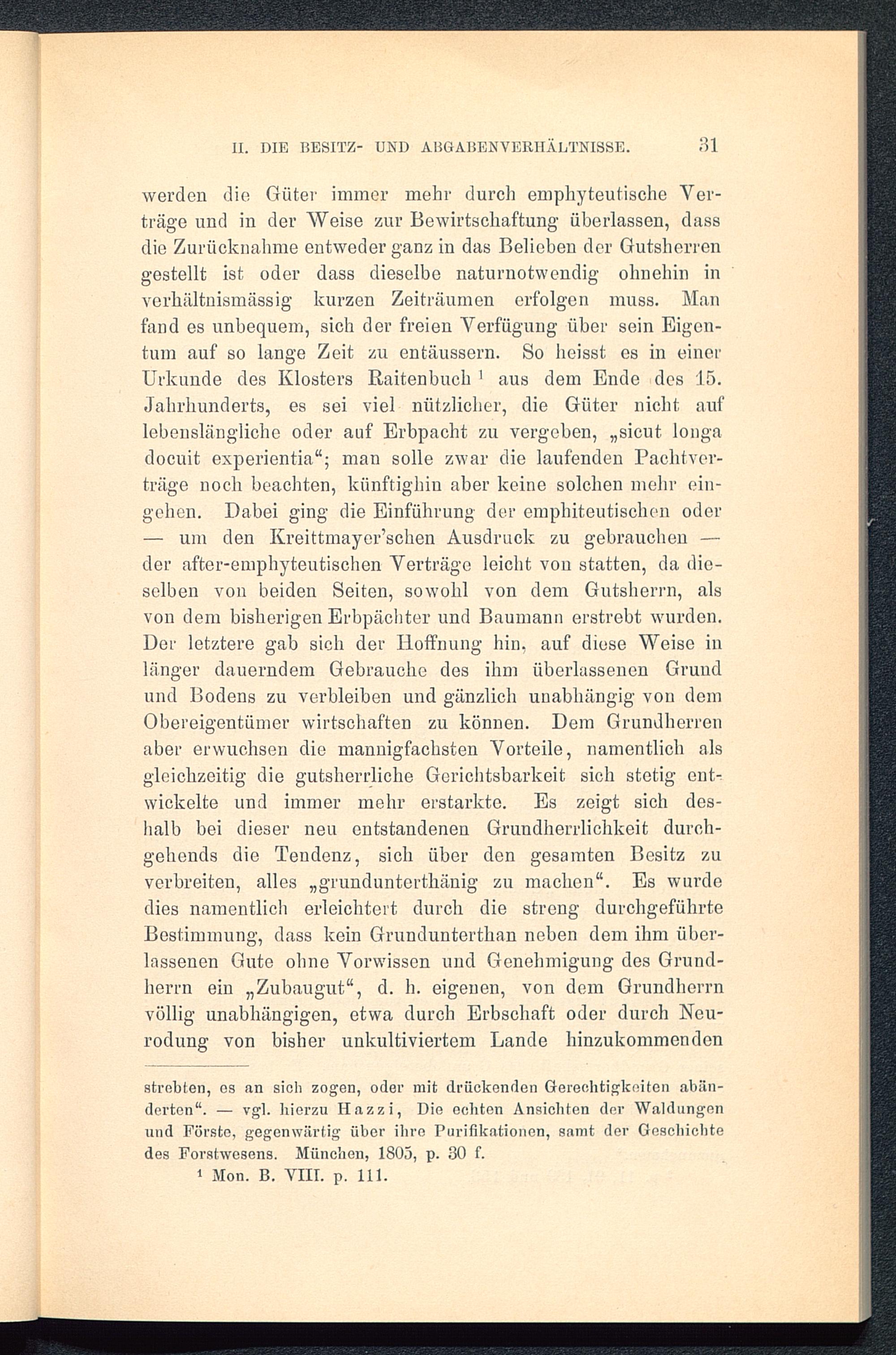 werden die Güter immer mehr durch emphyteutische Ver-träge und in der Weise zur Bewirtschaftung überlassen, dassdie Zurücknahme entweder ganz in das Belieben der Gutsherrengestellt ist oder dass dieselbe naturnotwendig ohnehin inverhältnismässig kurzen Zeiträumen erfolgen muss. Manfand es unbequem, sich der freien Verfügung über sein Eigen-tum auf so lange Zeit zu entäussern. So heisst es in einerUrkunde des Klosters Raitenbuch 1 aus dem Ende des 15.Jahrhunderts, es sei viel nützlicher, die Güter nicht auflebenslängliche oder auf Erbpacht zu vergeben, „sicut longadocuit experientia“; man solle zwar die laufenden Pachtver-träge noch beachten, künftighin aber keine solchen mehr ein-gehen. Dabei ging die Einführung der emphiteutischon oder— um den Kreittmayer’schen Ausdruck zu gebrauchen —der after-emphyteutischen Verträge leicht von statten, da die-selben von beiden Seiten, sowohl von dem Gutsherrn, alsvon dem bisherigen Erbpächter und Baumann erstrebt wurden.Der letztere gab sich der Hoffnung hin, auf diese Weise inlänger dauerndem Gebrauche des ihm überlassenen Grundund Bodens zu verbleiben und gänzlich unabhängig von domObereigentümer wirtschaften zu können. Dem Grundherrenaber erwuchsen die mannigfachsten Vorteile, namentlich alsgleichzeitig die gutsherrliche Gerichtsbarkeit sich stetig ent-wickelte und immer mehr erstarkte. Es zeigt sich des-halb bei dieser neu entstandenen Grundherrlichkeit durch-gehends die Tendenz, sich über den gesamten Besitz zuverbreiten, alles „grundunterthänig zu machen“. Es wurdedies namentlich erleichtert durch die streng durchgeführteBestimmung, dass kein Grunduntertlian neben dem ihm über-lassenen Gute ohne Vorwissen und Genehmigung des Grund-herrn ein „Zubaugut“, d. h. eigenen, von dem Grundherrnvöllig unabhängigen, etwa durch Erbschaft oder durch Neu-rodung von bisher unkultiviertem Lande hinzukommenden