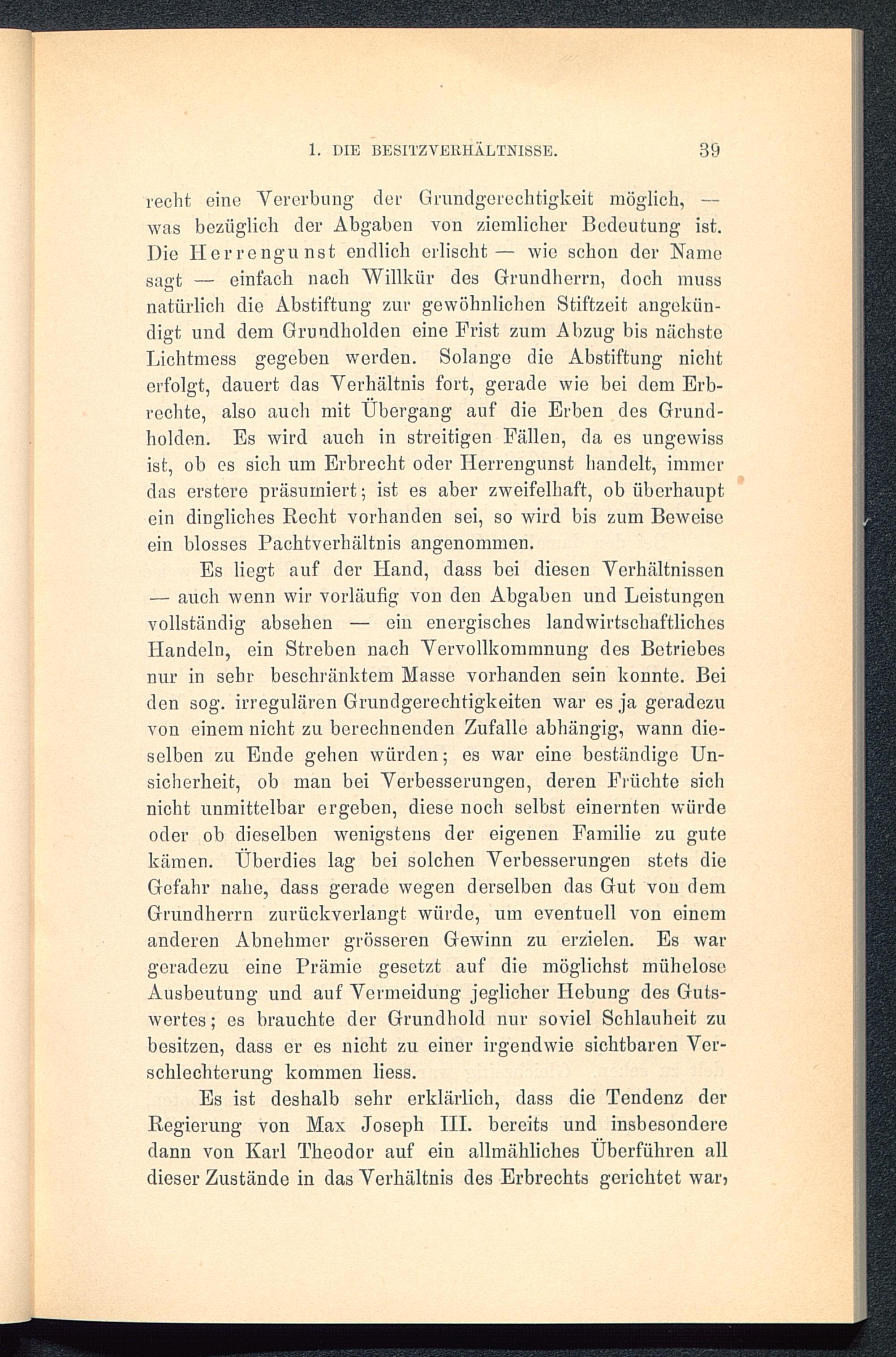 Es ist deshalb sehr erklärlich, dass die Tendenz derRegierung von Max Joseph III. bereits und insbesonderedann von Karl Theodor auf ein allmähliches Überführen alldieser Zustände in das Verhältnis des Erbrechts gerichtet war)