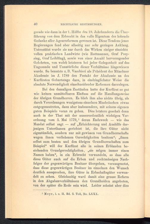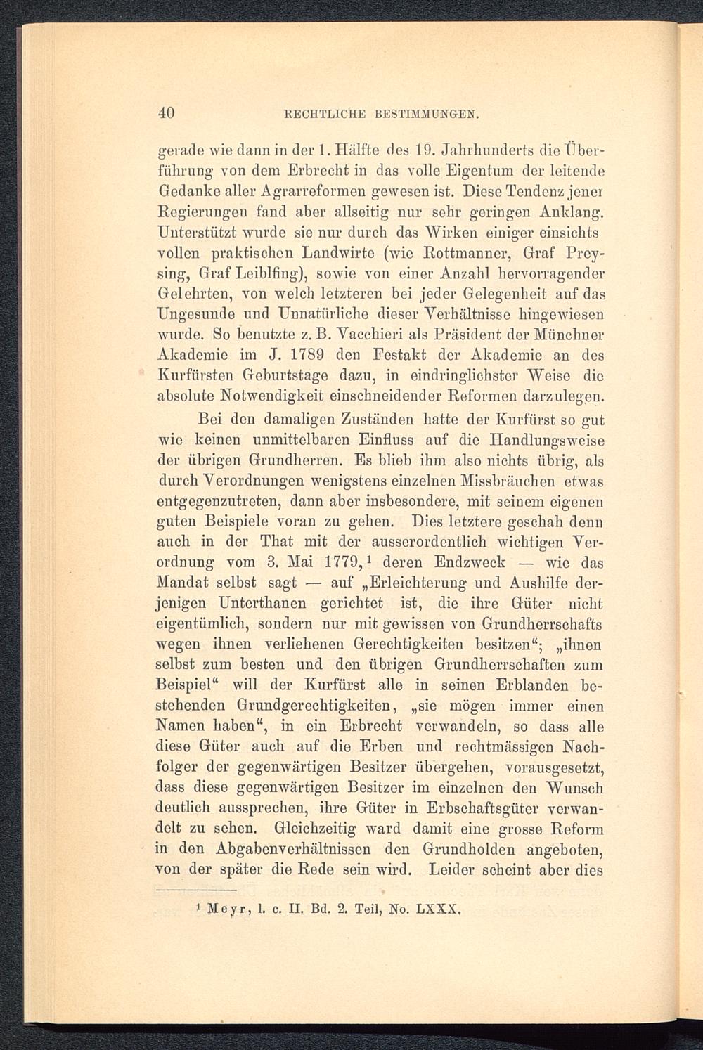 Bei den damaligen Zuständen hatte der Kurfürst so gutwie keinen unmittelbaren Einfluss auf die Handlungsweiseder übrigen Grundherren. Es blieb ihm also nichts übrig, alsdurch Verordnungen wenigstens einzelnen Missbrauchen etwasentgegenzutreten, dann aber insbesondere, mit seinem eigenenguten Beispiele voran zu gehen. Dies letztere geschah dennauch in der That mit der ausserordentlich wichtigen Ver-ordnung vom 3. Mai 1779, 1 deren Endzweck — wie dasMandat selbst sagt — auf „Erleichterung und Aushilfe der-jenigen Unterthanen gerichtet ist, die ihre Güter nichteigentümlich, sondern nur mit gewissen von Grundherrschaftswegen ihnen verliehenen Gerechtigkeiten besitzen“; „ihnenselbst zum besten und den übrigen Grundherrschaften zumBeispiel“ will der Kurfürst alle in seinen Erblanden be-stehenden Grundgerechtigkeiten, „sie mögen immer einenNamen haben“, in ein Erbrecht verwandeln, so dass allediese Güter auch auf die Erben und rechtmässigen Nach-folger der gegenwärtigen Besitzer übergehen, vorausgesetzt,dass diese gegenwärtigen Besitzer im einzelnen den Wunschdeutlich aussprechen, ihre Güter in Erbschaftsgüter verwan-delt zu sehen. Gleichzeitig ward damit eine grosse Reformin den Abgabenverhältnissen den Grundholden angeboten,von der später die Rede sein wird. Leider scheint aber dies