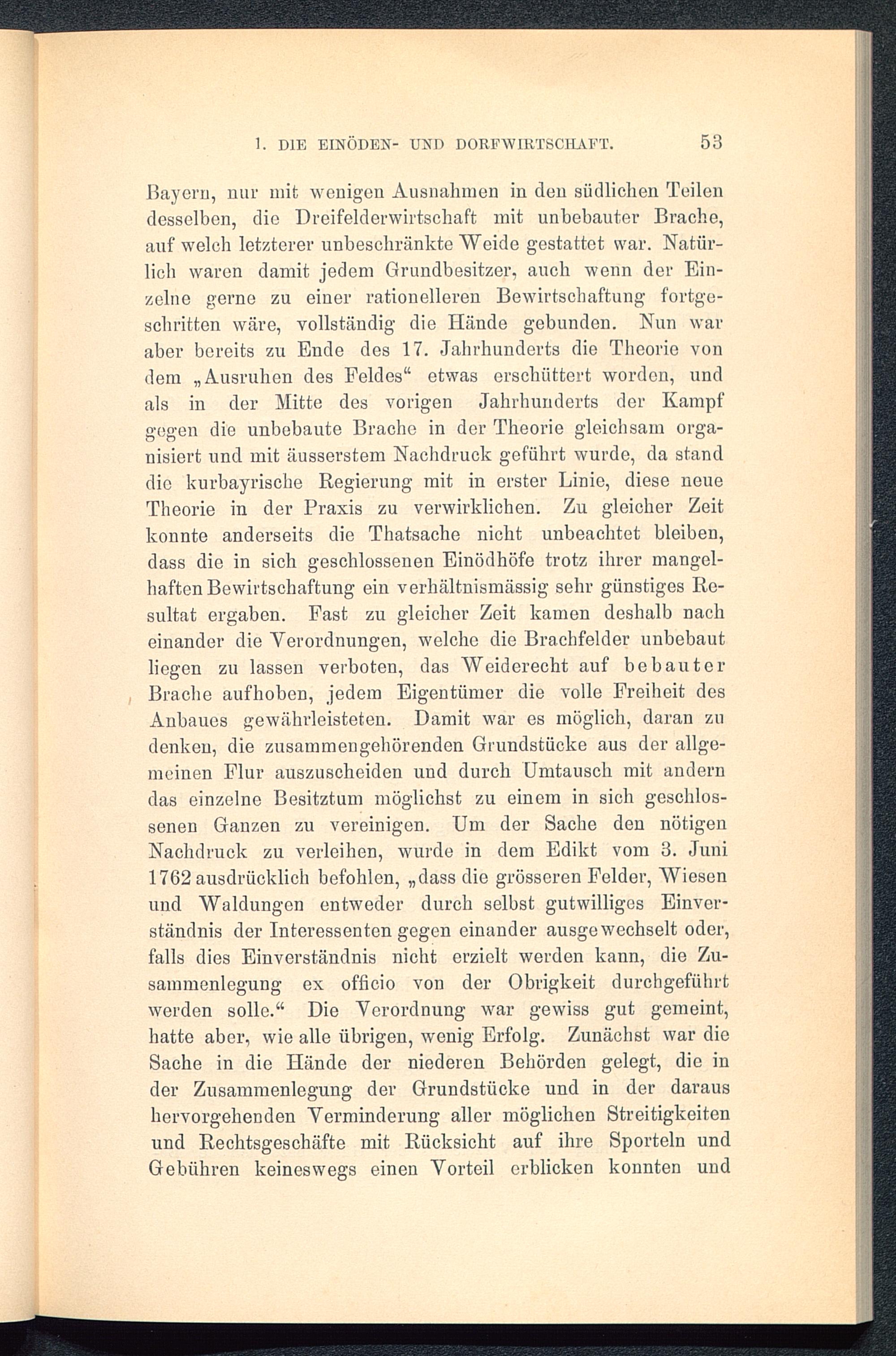 Bayern , nur mit wenigen Ausnahmen in den südlichen Teilendesselben, die Dreifelderwirtschaft mit unbebauter Brache,auf welch letzterer unbeschränkte "Weide gestattet war. Natür-lich waren damit jedem Grundbesitzer, auch wenn der Ein-zelne gerne zu einer rationelleren Bewirtschaftung fortge-schritten wäre, vollständig die Hände gebunden. Nun waraber bereits zu Ende des 17. Jahrhunderts die Theorie vondem „Ausruhen des Feldes“ etwas erschüttert worden, undals in der Mitte des vorigen Jahrhunderts der Kampfgegen die unbebaute Brache in der Theorie gleichsam orga-nisiert und mit äusserstem Nachdruck geführt wurde, da standdie kurbayrische Regierung mit in erster Linie, diese neueTheorie in der Praxis zu verwirklichen. Zu gleicher Zeitkonnte anderseits die Thatsache nicht unbeachtet bleiben,dass die in sich geschlossenen Einödhöfe trotz ihrer mangel-haften Bewirtschaftung ein verhältnismässig sehr günstiges Re-sultat ergaben. Fast zu gleicher Zeit kamen deshalb nacheinander die Verordnungen, welche die Brachfelder unbebautliegen zu lassen verboten, das Weiderecht auf bebauterBrache aufhoben, jedem Eigentümer die volle Freiheit desAnbaues gewährleisteten. Damit war es möglich, daran zudenken, die zusammengehörenden Grundstücke aus der allge-meinen Flur auszuscheiden und durch Umtausch mit anderndas einzelne Besitztum möglichst zu einem in sich geschlos-senen Ganzen zu vereinigen. Um der Sache den nötigenNachdruck zu verleihen, wurde in dem Edikt vom 3. Juni1762 ausdrücklich befohlen, „dass die grösseren Felder, Wiesenund Waldungen entweder durch selbst gutwilliges Einver-ständnis der Interessentengegen einander ausgewechselt oder,falls dies Einverständnis nicht erzielt werden kann, die Zu-sammenlegung ex officio von der Obrigkeit durchgeführtwerden solle.“ Die Verordnung war gewiss gut gemeint,hatte aber, wie alle übrigen, wenig Erfolg. Zunächst war dieSache in die Hände der niederen Behörden gelegt, die inder Zusammenlegung der Grundstücke und in der daraushervorgehenden Verminderung aller möglichen Streitigkeitenund Rechtsgeschäfte mit Rücksicht auf ihre Sporteln undGebühren keineswegs einen Vorteil erblicken konnten und