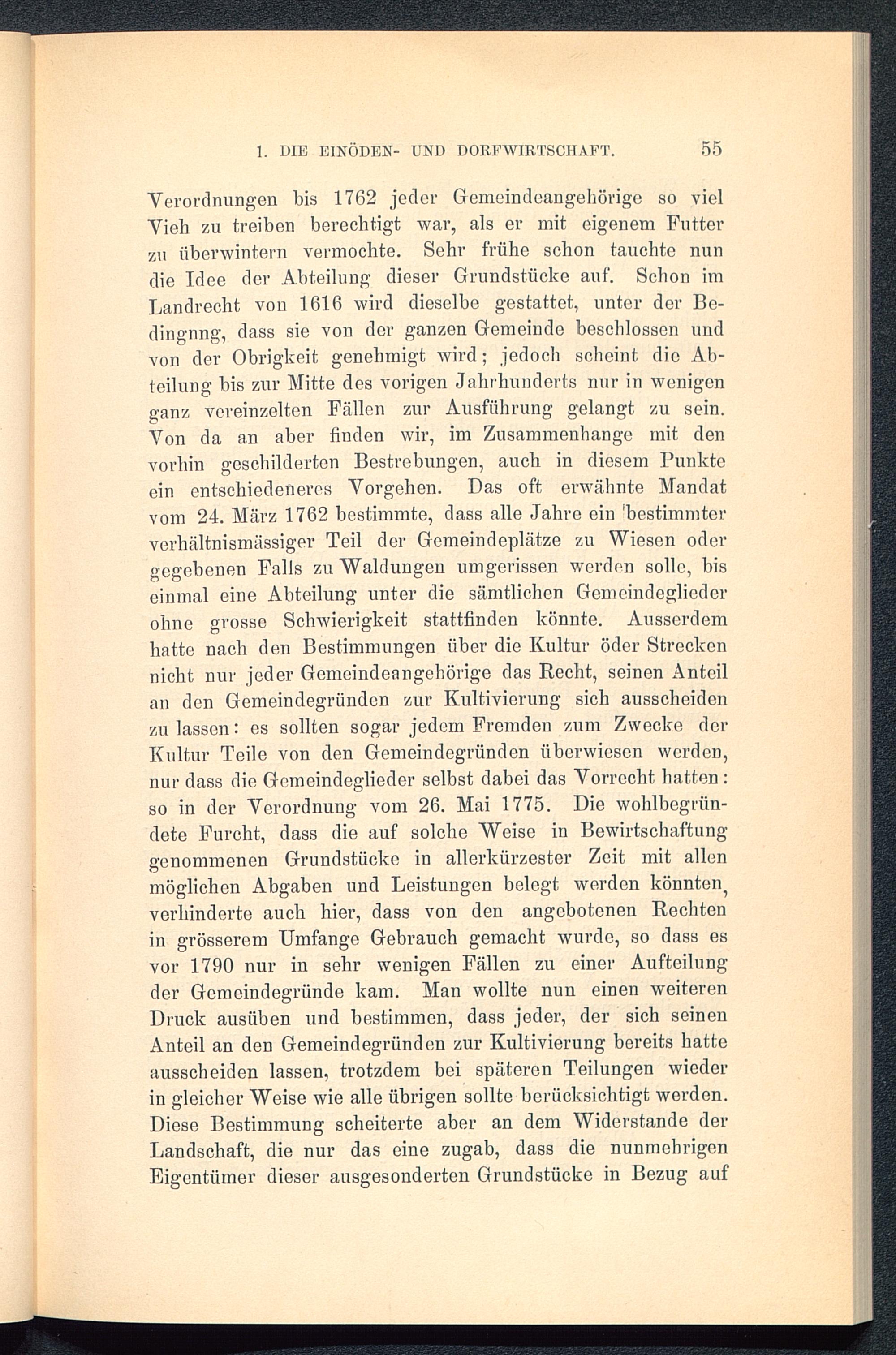 Verordnungen bis 1762 jeder Gemeindeangeliörige so vielVieh zu treiben berechtigt war, als er mit eigenem Futterzu überwintern vermochte. Sehr frühe schon tauchte nundie Idee der Abteilung dieser Grundstücke auf. Schon imLandrecht von 1616 wird dieselbe gestattet, unter der Be-dingung, dass sie von der ganzen Gemeinde beschlossen undvon der Obrigkeit genehmigt wird; jedoch scheint die Ab-teilung bis zur Mitte des vorigen Jahrhunderts nur in wenigenganz vereinzelten Fällen zur Ausführung gelangt zu sein.Von da an aber finden wir, im Zusammenhänge mit denvorhin geschilderten Bestrebungen, auch in diesem Punkteein entschiedeneres Vorgehen. Das oft erwähnte Mandatvom 24. März 1762 bestimmte, dass alle Jahre ein 'bestimmterverhältnismässiger Teil der Gemeindeplätze zu Wiesen odergegebenen Falls zu Waldungen umgerissen werden solle, biseinmal eine Abteilung unter die sämtlichen Gemeindegliederohne grosse Schwierigkeit stattfinden könnte. Ausserdemhatte nach den Bestimmungen über die Kultur öder Streckennicht nur jeder Gemeindeangehörige das Recht, seinen Anteilan den Gemeindegründen zur Kultivierung sich ausschoidenzu lassen: es sollten sogar jedem Fremden zum Zwecke derKultur Teile von den Gemeindegründen überwiesen werden,nur dass die Gemeindeglieder selbst dabei das Vorrecht hatten:so in der Verordnung vom 26. Mai 1775. Die wohlbegrün-dete Furcht, dass die auf solche Weise in Bewirtschaftunggenommenen Grundstücke in allerkürzester Zeit mit allenmöglichen Abgaben und Leistungen belegt werden könnten^verhinderte auch hier, dass von den angebotenen Rechtenin grösserem Umfange Gebrauch gemacht wurde, so dass esvor 1790 nur in sehr wenigen Fällen zu einer Aufteilungder Gemeindegründe kam. Man wollte nun einen weiterenDruck ausüben und bestimmen, dass jeder, der sich seinenAnteil an den Gemeindegründen zur Kultivierung bereits hatteausscheiden lassen, trotzdem bei späteren Teilungen wiederin gleicher Weise wie alle übrigen sollte berücksichtigt werden.Diese Bestimmung scheiterte aber an dem Widerstande derLandschaft, die nur das eine zugab, dass die nunmehrigenEigentümer dieser ausgesonderten Grundstücke in Bezug auf