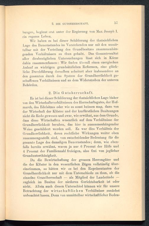 Es ist bei dieser Schilderung der thatsächlichen Lage bishervon den Wirtschaftsverhältnissen des Herrschaftsgutes, der Ilof-march, des Edelsitzes oder wie es sonst heissen mag, dann vonder Wirtschaft der Klöster und der kurfürstlichen Besitzungennicht die Rede gewesen und zwar, wie erwähnt, aus dem Grunde,dass diese Wirtschaften wesentlich auf dem Verhältnisse derGrundherrlichkeit beruhen, das hier in zusammenhängenderWeise geschildert werden soll. Es war dies Verhältnis derGrundherrlichkeit, deren rechtliche Wirkungen weiter obenzusammengestellt sind, von entscheidender Bedeutung für diegesamte Lage des damaligen Bauernstandes; denn, wie eben-falls bereits erwähnt, waren ja nur 6 Prozent der Höfe und4 Prozent der Eamilienzahl freioigen, also frei von jeglicherGrund unterthänigkeit.