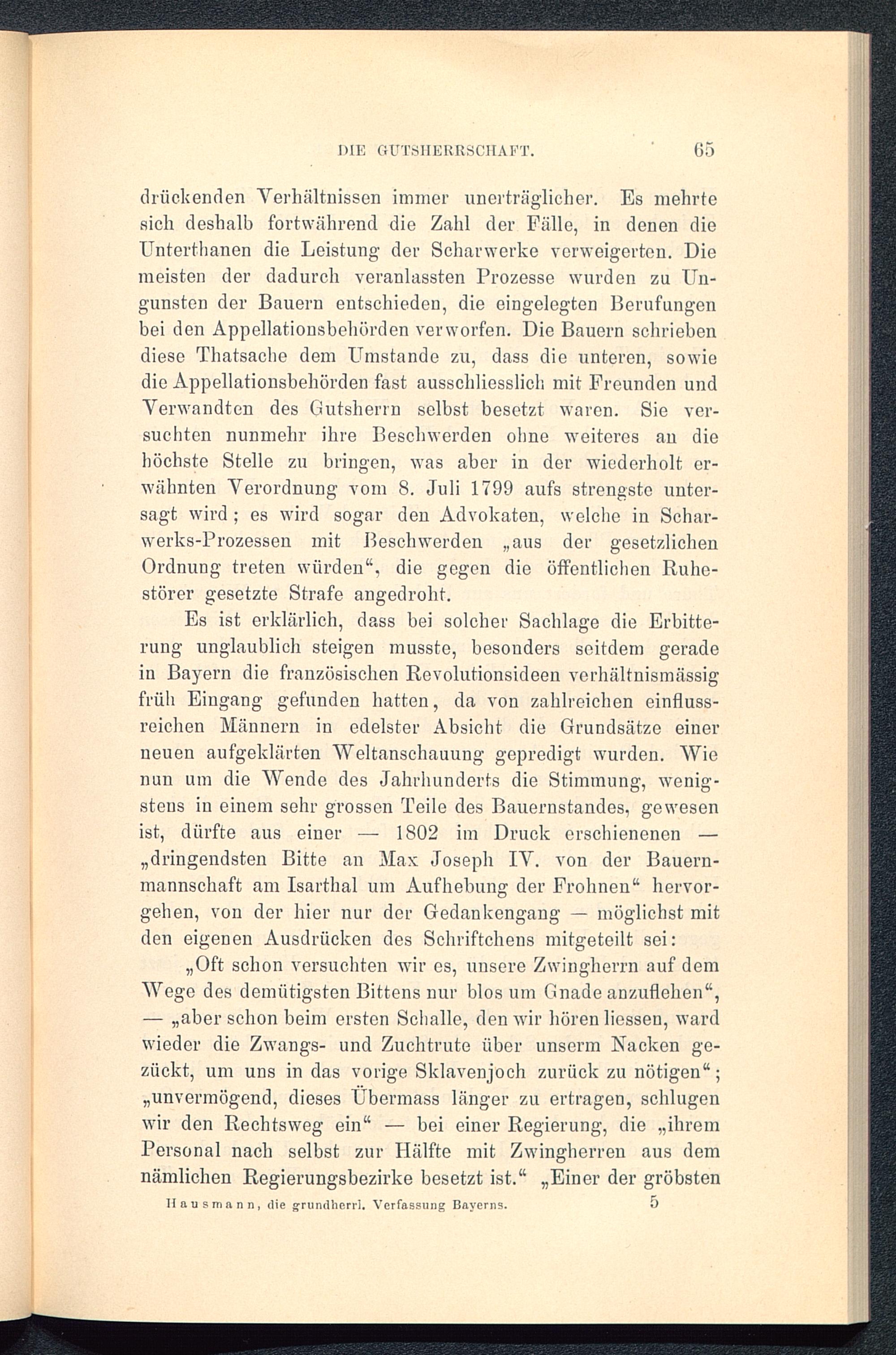 Es ist erklärlich, dass bei solcher Sachlage die Erbitte-rung unglaublich steigen musste, besonders seitdem geradein Bayern die französischen Revolutionsideen verhältnismässigfrüh Eingang gefunden hatten, da von zahlreichen einfluss-reichen Männern in edelster Absicht die Grundsätze einerneuen aufgeklärten Weltanschauung gepredigt wurden. Wienun um die Wende des Jahrhunderts die Stimmung, wenig-stens in einem sehr grossen Teile des Bauernstandes, gewesenist, dürfte aus einer — 1802 im Druck erschienenen —„dringendsten Bitte an Max Joseph IV. von der Bauern-mannschaft am Isarthal um Aufhebung der Frohnen“ hervor-gehen, von der hier nur der Gedankengang — möglichst mitden eigenen Ausdrücken des Schriftchens mitgeteilt sei: