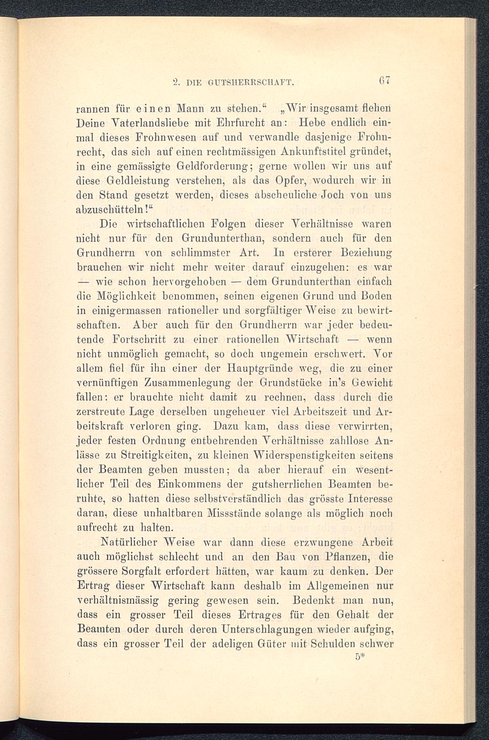 Die wirtschaftlichen Folgen dieser Verhältnisse warennicht nur für den Grundunterthan, sondern auch für denGrundherrn von schlimmster Art. In ersterer Beziehungbrauchen wir nicht mehr weiter darauf einzugehen: es war— wie schon hervorgehoben — dem Grundunterthan einfachdie Möglichkeit benommen, seinen eigenen Grund und Bodenin einigermassen rationeller und sorgfältiger Weise zu bewirt-schaften. Aber auch für den Grundherrn war jeder bedeu-tende Fortschritt zu einer rationellen Wirtschaft — wennnicht unmöglich gemacht, so doch ungemein erschwert. Vorallem fiel für ihn einer der Hauptgründe weg, die zu einervernünftigen Zusammenlegung der Grundstücke in’s Gewichtfallen: er brauchte nicht damit zu rechnen, dass durch diezerstreute Lage derselben ungeheuer viel Arbeitszeit und Ar-beitskraft verloren ging. Dazu kam, dass diese verwirrten,jeder festen Ordnung entbehrenden Verhältnisse zahllose An-lässe zu Streitigkeiten, zu kleinen Widerspenstigkeiten seitensder Beamten geben mussten; da aber hierauf ein wesent-licher Teil des Einkommens der gutsherrlichen Beamten be-ruhte, so hatten diese selbstverständlich das grösste Interessedaran, diese unhaltbaren Missstände solange als möglich nochaufrecht zu halten.