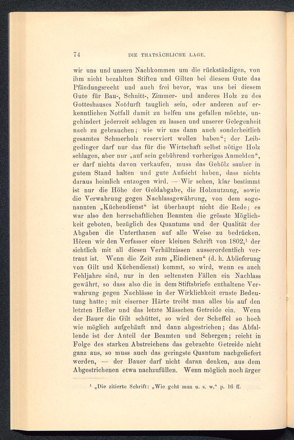 wir uns und unsern Nachkommen um die rückständigen, vonihm nicht bezahlten Stiften und Gilten bei diesem Gute dasPfändungsrecht und auch frei bevor, was uns bei diesemGute für Bau-, Schnitt-, Zimmer- und anderes Holz zu desGotteshauses Notdurft tauglich sein, oder anderen auf er-kenntlichen Notfall damit zu helfen uns gefallen möchte, un-gehindert jederzeit schlagen zu lassen und unserer Gelegenheitnach zu gebrauchen; wie wir uns dann auch sondcrheitlichgesamtes Schmerholz reserviert wollen haben“; der Leib-gedinger darf nur das für die Wirtschaft selbst nötige Holzschlagen, aber nur „auf sein gebührend vorheriges Anmelden“,er darf nichts davon verkaufen, muss das Gehölz sauber ingutem Stand halten und gute Aufsicht haben, dass nichtsdaraus heimlich entzogen wird. —Wir sehen, klar bestimmtist nur die Höhe der Geldabgabe, die Holznutzung, sowiedie Verwahrung gegen Nachlassgewährung, von dem soge-nannten „Küchendienst“ ist überhaupt nicht die Rede; eswar also den herrschaftlichen Beamten die grösste Möglich-keit geboten, bezüglich des Quantums und der Qualität derAbgaben die Unterthanen auf alle Weise zu bedrücken.Hören wir den Verfasser einer kleinen Schrift von 1802, 1 dersichtlich mit all diesen Verhältnissen ausserordentlich ver-traut ist. Wenn die Zeit zum „Eindienen“ (d. h. Ablieferungvon Gilt und Küchendienst) kommt, so wird, wenn es auchFehljahre sind, nur in den seltensten Fällen ein Nachlassgewährt, so dass also die in dem Stiftsbriefe enthaltene Ver-wahrung gegen Nachlässe in der Wirklichkeit ernste Bedeu-tung hatte; mit eiserner Härte treibt man alles bis auf denletzten Heller und das letzte Mässchen Getreide ein. Wennder Bauer die Gilt schüttet, so wird der Scheffel so hochwie möglich aufgehäuft nnd dann abgestrichen; das Abfal-lende ist der Anteil der Beamten und Schergen; reicht inFolge des starken Abstreichens das gebrachte Getreide nichtganz aus, so muss auch das geringste Quantum nachgeliefertwerden, — der Bauer darf nicht daran denken, aus demAbgestrichenen etwa nachzufüllen. Wenn möglich noch ärger
