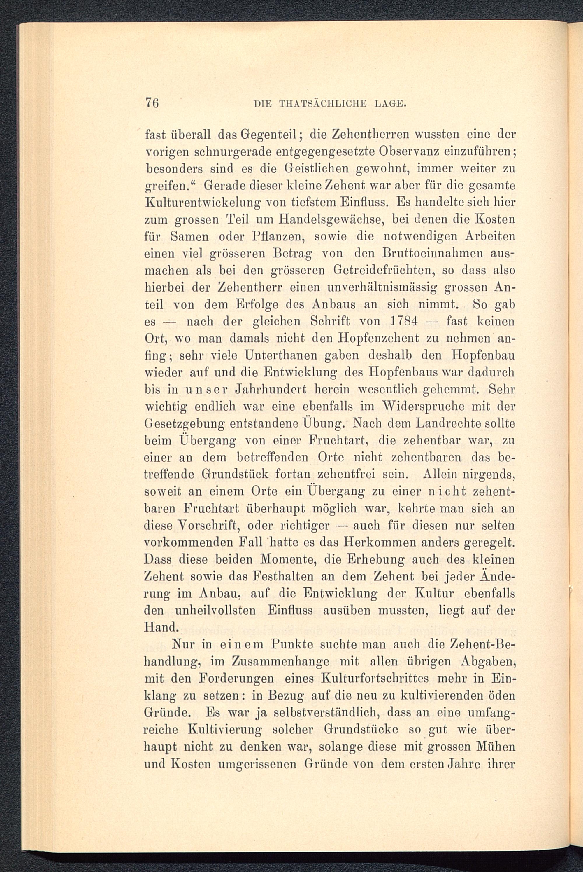 fast überall das Gegenteil; die Zehentherren wussten eine dervorigen schnurgerade entgegengesetzte Observanz einzuführen;besonders sind es die Geistlichen gewohnt, immer weiter zugreifen.“ Gerade dieser kleine Zehent war aber für die gesamteKulturentwickelung von tiefstem Einfluss. Es handelte sich hierzum grossen Teil um Handelsgewächse, bei denen die Kostenfür Sarnen oder Pflanzen, sowie die notwendigen Arbeiteneinen viel grösseren Betrag von den Bruttoeinnahmen aus-machen als bei den grösseren Getreidefrüchten, so dass alsohierbei der Zehentherr einen unverhältnismässig grossen An-teil von dem Erfolge des Anbaus an sich nimmt. So gabes — nach der gleichen Schrift von 1784 — fast keinenOrt, wo man damals nicht den Hopfenzehent zu nehmen an-fing; sehr viele Unterthanen gaben deshalb den Ilopfenbauwieder auf und die Entwicklung des Hopfenbaus war dadurchbis in unser Jahrhundert herein wesentlich gehemmt. Sehrwichtig endlich war eine ebenfalls im Widerspruche mit derGesetzgebung entstandene Übung. Nach dem Landrechte solltebeim Übergang von einer Fruchtart, die zehentbar war, zueiner an dem betreffenden Orte nicht zeheutbaren das be-treffende Grundstück fortan zehentfrei sein. Allein nirgends,soweit an einem Orte ein Übergang zu einer nicht zehent-baren Fruchtart überhaupt möglich war, kehrte man sich andiese Vorschrift, oder richtiger — auch für diesen nur seltenvorkommenden Fall hatte es das Herkommen anders geregelt.Dass diese beiden Momente, die Erhebung auch des kleinenZehent sowie das Festhalten an dem Zehent bei jeder Ände-rung im Anbau, auf die Entwicklung der Kultur ebenfallsden unheilvollsten Einfluss ausüben mussten, liegt auf derHand.