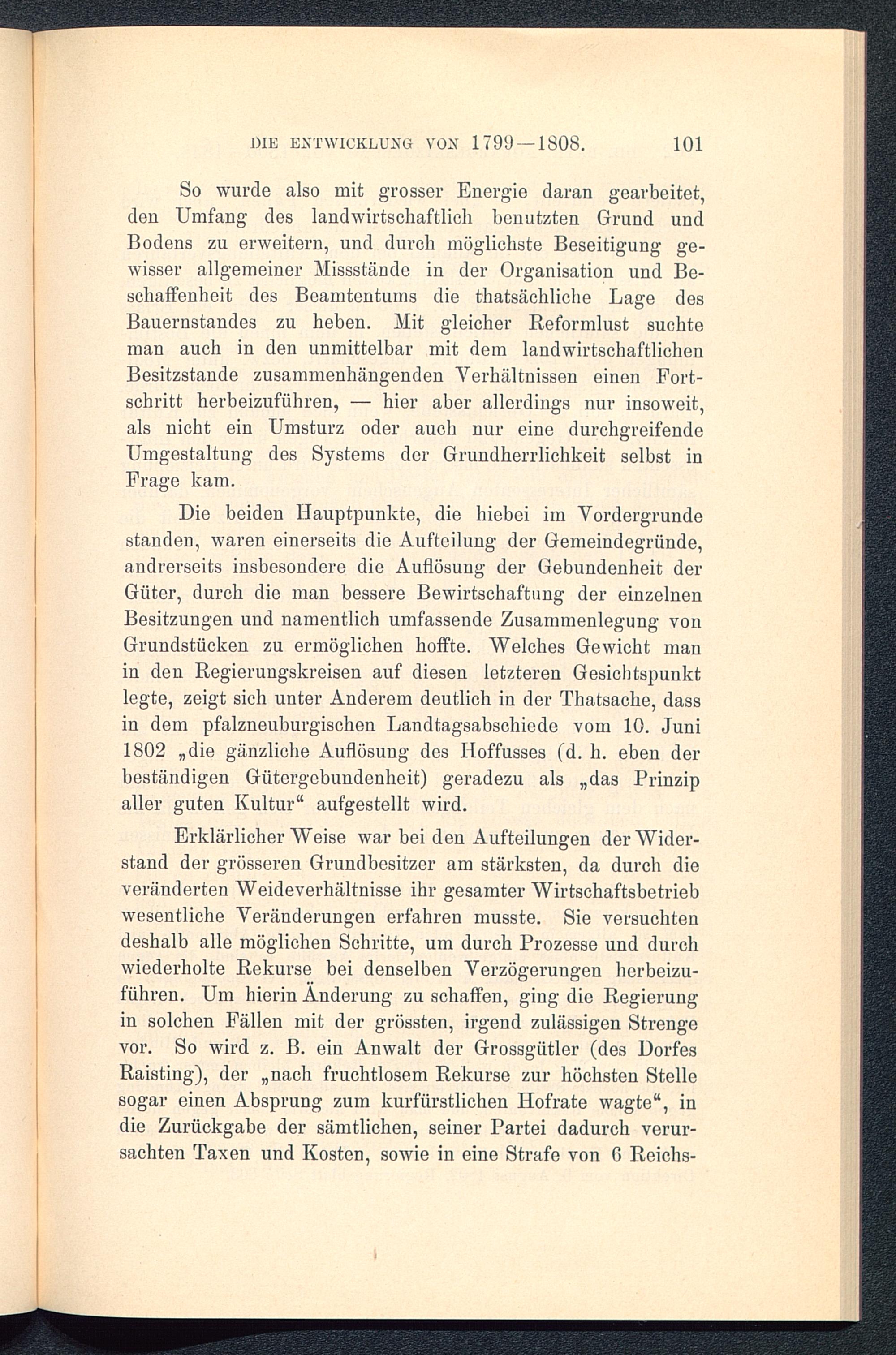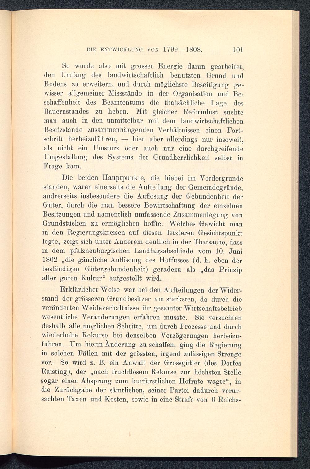 Die beiden Hauptpunkte, die hiebei im Vordergründestanden, waren einerseits die Aufteilung der Gemeindegründe,andrerseits insbesondere die Auflösung der Gebundenheit derGüter, durch die man bessere Bewirtschaftung der einzelnenBesitzungen und namentlich umfassende Zusammenlegung vonGrundstücken zu ermöglichen hoffte. Welches Gewicht manin den Regierungskreisen auf diesen letzteren Gesichtspunktlegte, zeigt sich unter Anderem deutlich in der Thatsache, dassin dem pfalzneuburgischen Landtagsabschiede vom 10. Juni1802 „die gänzliche Auflösung des Hoffusses (d. h. eben derbeständigen Gütergebundenheit) geradezu als „das Prinzipaller guten Kultur“ aufgestellt wird.