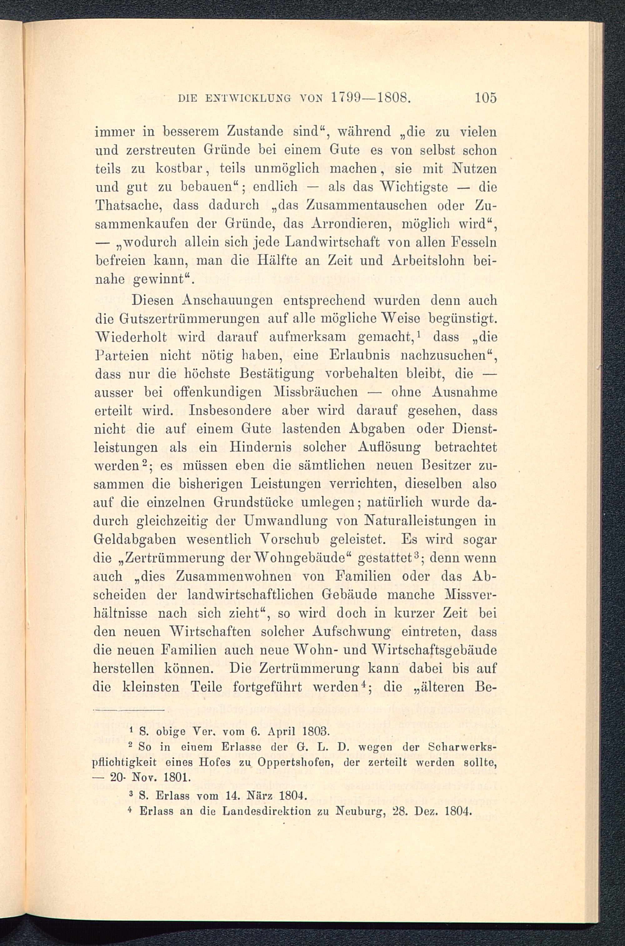 Diesen Anschauungen entsprechend wurden denn auchdie Gutszertrümmerungen auf alle mögliche Weise begünstigt.Wiederholt wird darauf aufmerksam gemacht , 1 dass „dieParteien nicht nötig haben, eine Erlaubnis nachzusuchen“,dass nur die höchste Bestätigung Vorbehalten bleibt, die —ausser bei offenkundigen Missbräuchen — ohne Ausnahmeerteilt wird. Insbesondere aber wird darauf gesehen, dassnicht die auf einem Gute lastenden Abgaben oder Dienst-leistungen als ein Hindernis solcher Auflösung betrachtetwerden 2 ; es müssen eben die sämtlichen neuen Besitzer zu-sammen die bisherigen Leistungen verrichten, dieselben alsoauf die einzelnen Grundstücke umlegen; natürlich wurde da-durch gleichzeitig der Umwandlung von Naturalleistungen iuGeldabgaben wesentlich Vorschub geleistet. Es wird sogardie „Zertrümmerung der Wohngebäude“ gestattet 3 ; denn wennauch „dies Zusammenwohnen von Familien oder das Ab-scheiden der landwirtschaftlichen Gebäude manche Missver-hältnisse nach sich zieht“, so wird doch in kurzer Zeit beiden neuen Wirtschaften solcher Aufschwung eintreten, dassdie neuen Familien auch neue Wohn- und Wirtschaftsgebäudehersteilen können. Die Zertrümmerung kann dabei bis aufdie kleinsten Teile fortgeführt werden 4 ; die „älteren Be-