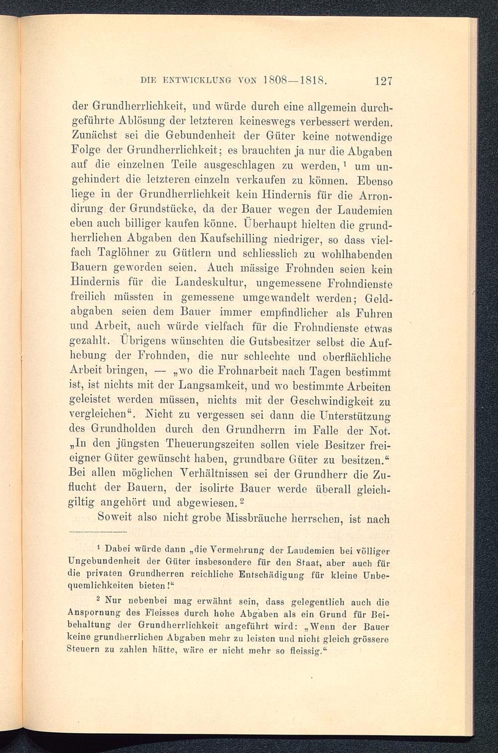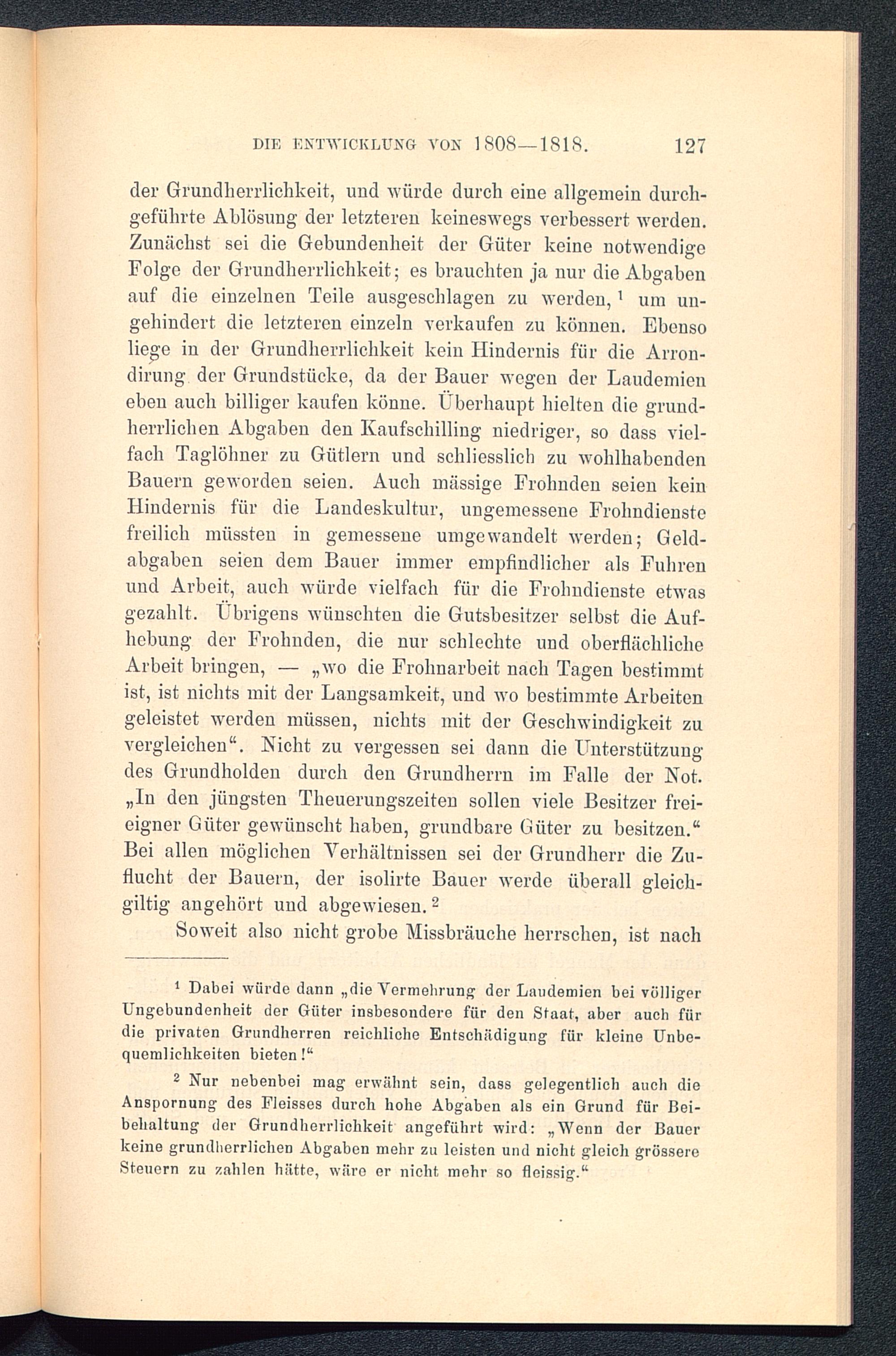 2 Nur nebenbei mag erwähnt sein, dass gelegentlich auch dieAnspornung des Fleisses durch hohe Abgaben als ein Grund für Bei-behaltung der Grundlierrlichkeit angeführt wird: „Wenn der Bauerkeine grundherrlichen Abgaben mehr zu leisten und nicht gleich grössereSteuern zu zahlen hätte, wäre er nicht mehr so fleissig.“