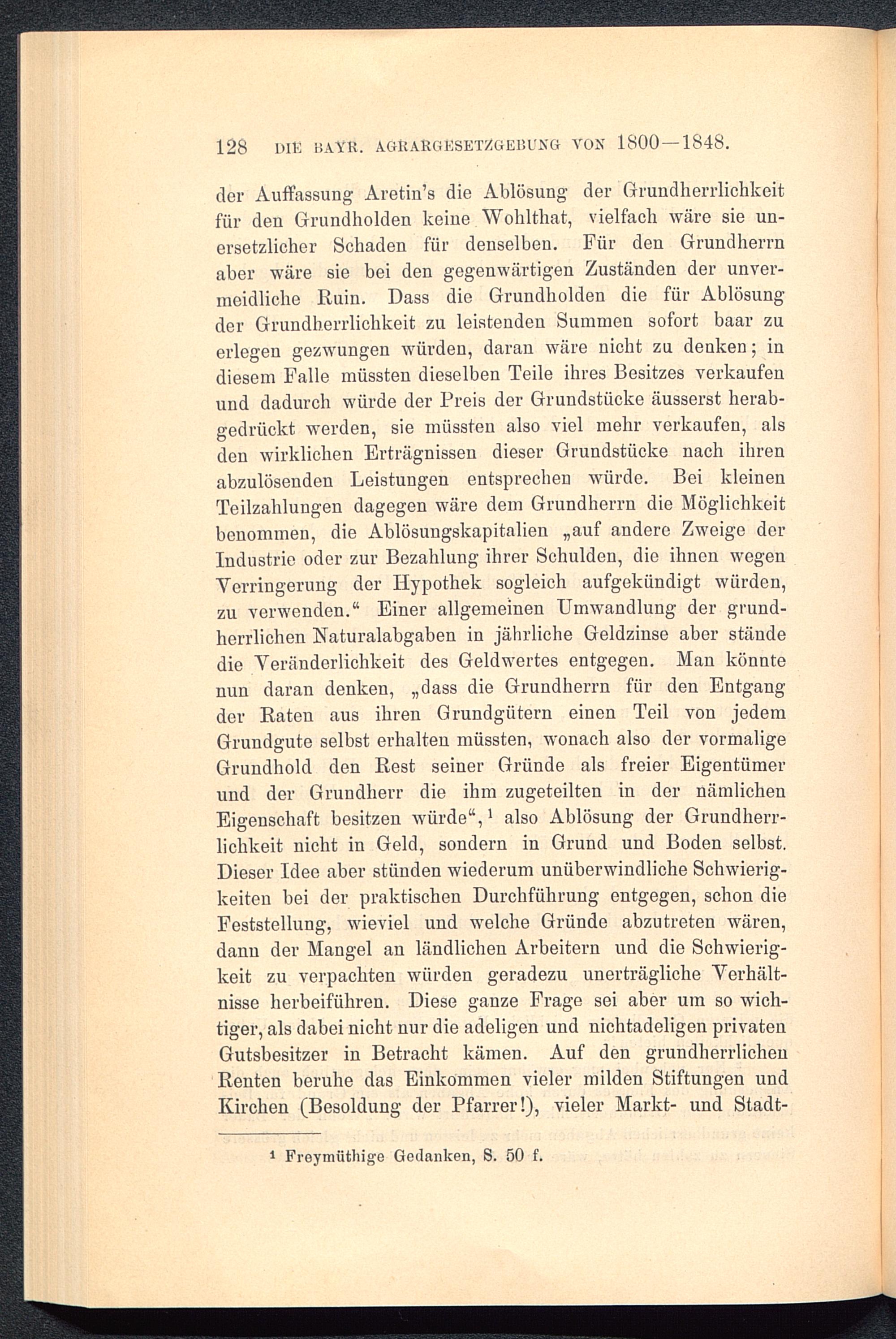 der Auffassung Aretin’s die Ablösung der Grundherrlichkeitfür den Grundholden keine Wohlthat, vielfach wäre sie un-ersetzlicher Schaden für denselben. Für den Grundherrnaber wäre sie bei den gegenwärtigen Zuständen der unver-meidliche Ruin. Dass die Grundholden die für Ablösungder Grundherrlichkeit zu leistenden Summen sofort baar zuerlegen gezwungen würden, daran wäre nicht zu denken; indiesem Falle müssten dieselben Teile ihres Besitzes verkaufenund dadurch würde der Preis der Grundstücke äusserst herab-gedrückt werden, sie müssten also viel mehr verkaufen, alsden wirklichen Erträgnissen dieser Grundstücke nach ihrenabzulösenden Leistungen entsprechen würde. Bei kleinenTeilzahlungen dagegen wäre dem Grundherrn die Möglichkeitbenommen, die Ablösungskapitalien „auf andere Zweige derIndustrie oder zur Bezahlung ihrer Schulden, die ihnen wegenVerringerung der Hypothek sogleich aufgekündigt würden,zu verwenden.“ Einer allgemeinen Umwandlung der grund-herrlichen Naturalabgaben in jährliche Geldzinse aber ständedie Veränderlichkeit des Geldwertes entgegen. Man könntenun daran denken, „dass die Grundherrn für den Entgangder Raten aus ihren Grundgütern einen Teil von jedemGrundgute selbst erhalten müssten, wonach also der vormaligeGrundhold den Rest seiner Gründe als freier Eigentümerund der Grundherr die ihm zugeteilten in der nämlichenEigenschaft besitzen würde “, 1 also Ablösung der Grundherr-lichkeit nicht in Geld, sondern in Grund und Boden selbst.Dieser Idee aber stünden wiederum unüberwindliche Schwierig-keiten bei der praktischen Durchführung entgegen, schon dieFeststellung, wieviel und welche Gründe abzu treten wären,dann der Mangel an ländlichen Arbeitern und die Schwierig-keit zu verpachten würden geradezu unerträgliche Verhält-nisse herbeiführen. Diese ganze Frage sei aber um so wich-tiger, als dabei nicht nur die adeligen und nichtadeligen privatenGutsbesitzer in Betracht kämen. Auf den grundherrlichenRenten beruhe das Einkommen vieler milden Stiftungen undKirchen (Besoldung der Pfarrer!), vieler Markt- und Stadt-