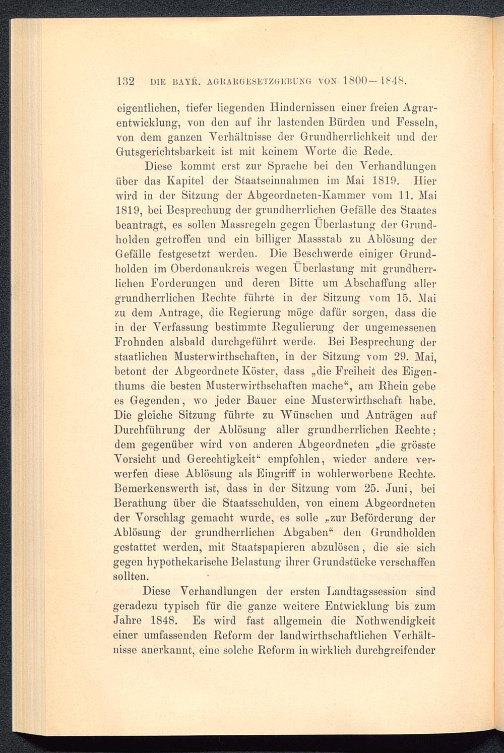 Diese kommt erst zur Sprache bei den Verhandlungenüber das Kapitel der Staatseinnahmen im Mai 1819. Hierwird in der Sitzung der Abgeordneten-Kammer vom 11. Mai1819, bei Besprechung der grundherrlichen Gefälle des Staatesbeantragt, es sollen Massregeln gegen Überlastung der Grund-holden getroffen und ein billiger Massstab zu Ablösung derGefälle festgesetzt werden. Die Beschwerde einiger Grund-holdeu im Oberdonaukreis wegen Überlastung mit grundherr -lieben Forderungen und deren Bitte um Abschaffung allergrundherrlichen Rechte führte in der Sitzung vom 15. .Maizu dem Anträge, die Regierung möge dafür sorgen, dass diein der Verfassung bestimmte Regulierung der ungemessenenFrohnden alsbald durchgeführt werde. Bei Besprechung derstaatlichen Musterwirtschaften, in der Sitzung vom 29. Mai,betont der Abgeordnete Köster, dass „die Freiheit des Eigen-thums die besten Musterwirtschaften mache“, am Rhein gebees Gegenden, wo jeder Bauer eine Musterwirtschaft habe.Die gleiche Sitzung führte zu Wünschen und Anträgen aufDurchführung der Ablösung aller grundherrlichen Rechte;dem gegenüber wird von anderen Abgeordneten „die grössteVorsicht und Gerechtigkeit“ empfohlen, wieder andere ver-werfen diese Ablösung als Eingriff in wohlerworbene Rechte.Bemerkenswerth ist, dass in der Sitzung vom 25. Juni, beiBeratung über die Staatsschulden, von einem Abgeordnetender Vorschlag gemacht wurde, es solle „zur Beförderung derAblösung der grundherrlichen Abgaben“ den Grundholdengestattet werden, mit Staatspapieren abzulöseu, die sie sichgegen hypothekarische Belastung ihrer Grundstücke verschaffensollten.