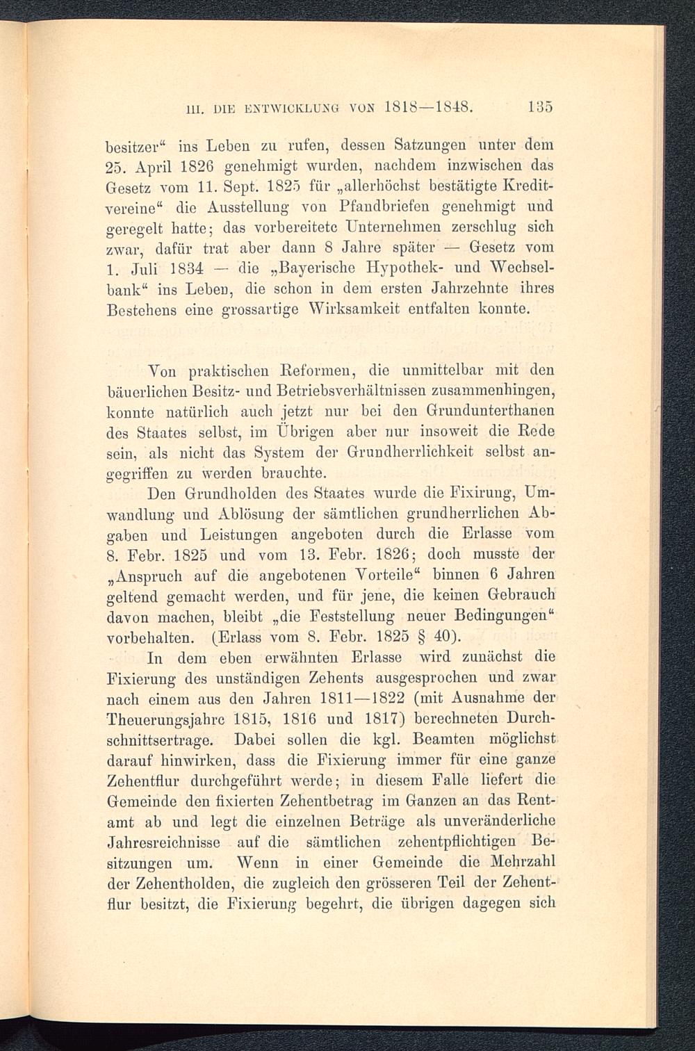 Den Grundholden des Staates wurde die Fixirung, Um-wandlung und Ablösung der sämtlichen grundherrlichen Ab-gaben und Leistungen angeboten durch die Erlasse vom8. Febr. 1825 und vom 13. Febr. 1826; doch musste der„Anspruch auf die angebotenen Vorteile“ binnen 6 Jahrengeltend gemacht werden, und für jene, die keinen Gebrauchdavon machen, bleibt „die Feststellung neuer Bedingungen“Vorbehalten. (Erlass vom 8. Febr. 1825 § 40).