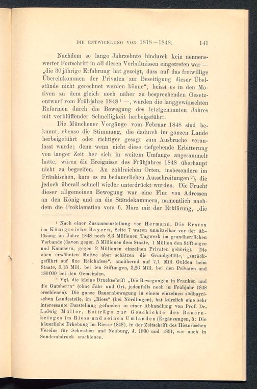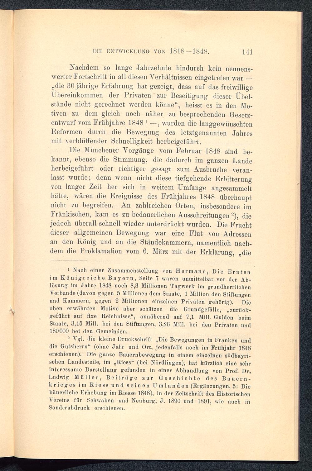 2 Vgl. die kleine Druckschrift „Die Bewegungen in Franken unddie Gutsherrn“ (ohne Jahr und Ort, jedenfalls noch im Frühjahr 1848erschienen). Die ganze Bauernbewegung in einem einzelnen südbayri-schen Landesteile, im „Riess“ (bei Nördlingon), hat kürzlich eine sehrinteressante Darstellung gefunden in einer Abhandlung von Prof. Dr.Ludwig Müller, Beiträge zur Geschichte des Bauern-krieges im Riess und seinen Umlanden (Ergänzungen, 5: Diebäuerliche Erhebung im Riesso 1848), in der Zeitschrift des HistorischenVereins für Schwaben und Neuburg, J. 1890 und 1891, wie auch inSonderabdruck erschienen.