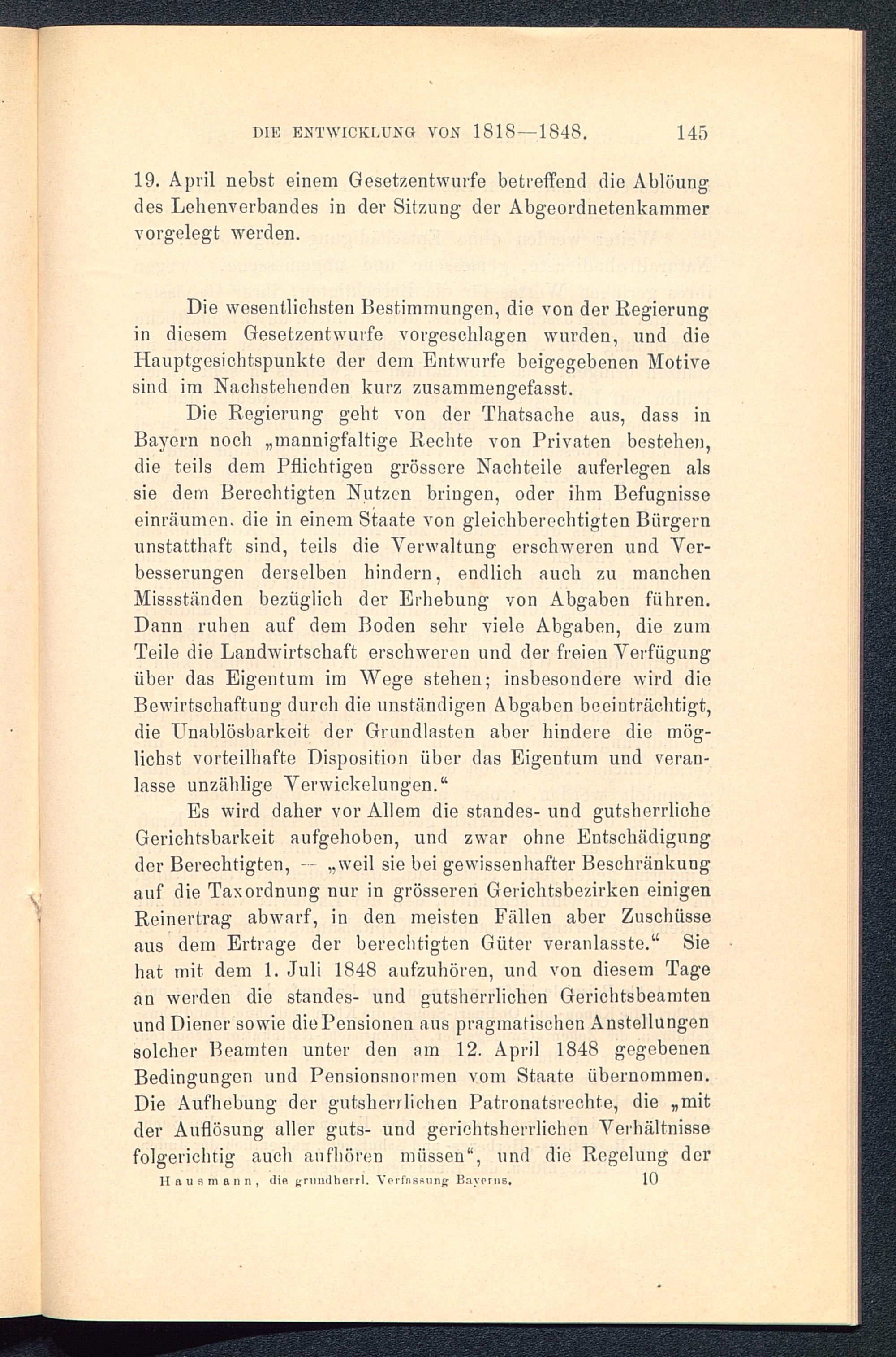 Die Regierung geht von der Thatsache aus, dass inBayern noch „mannigfaltige Rechte von Privaten bestehen,die teils dem Pflichtigen grössere Nachteile auferlegen alssie dem Berechtigten Nutzen bringen, oder ihm Befugnisseeinräumen, die in einem Staate von gleichberechtigten Bürgernunstatthaft sind, teils die Verwaltung erschweren und Ver-besserungen derselben hindern, endlich auch zu manchenMissständen bezüglich der Erhebung von Abgaben führen.Dann ruhen auf dem Boden sehr viele Abgaben, die zumTeile die Landwirtschaft erschweren und der freien Verfügungüber das Eigentum im Wege stehen; insbesondere wird dieBewirtschaftung durch die unständigen Abgaben beeinträchtigt,die Unablösbarkeit der Grundlastcn aber hindere die mög-lichst vorteilhafte Disposition über das Eigentum und veran-lasse unzählige Verwickelungen.“
