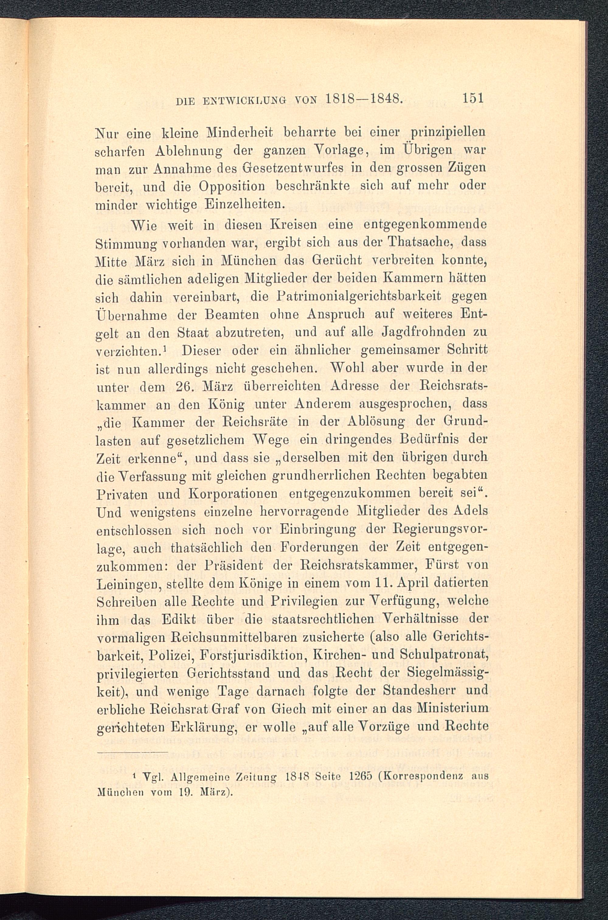 Wie weit in diesen Kreisen eine entgegenkommendeStimmung vorhanden war, ergibt sich aus der Thatsache, dassMitte März sich in München das Gerücht verbreiten konnte,die sämtlichen adeligen Mitglieder der beiden Kammern hättensich dahin vereinbart, die Patrimonialgerichtsbarkeit gegenÜbernahme der Beamten ohne Anspruch auf weiteres Ent-gelt an den Staat abzutreten, und auf alle Jagdfrohnden zuverzichten. 1 Dieser oder ein ähnlicher gemeinsamer Schrittist nun allerdings nicht geschehen. Wohl aber wurde in derunter dem 26. März überreichten Adresse der Reichsrats-kammer an den König unter Anderem ausgesprochen, dass„die Kammer der Reichsräte in der Ablösung der Grund-lasten auf gesetzlichem Wege ein dringendes Bedürfnis derZeit erkenne“, und dass sie „derselben mit den übrigen durchdie Verfassung mit gleichen grundherrlichen Rechten begabtenPrivaten und Korporationen entgegenzukommen bereit sei“.Und wenigstens einzelne hervorragende Mitglieder des Adelsentschlossen sich noch vor Einbringung der Regierungsvor-lage, auch thatsächlich den Forderungen der Zeit entgegen-zukommen: der Präsident der Reichsratskammer, Fürst vonLeiningen, stellte dem Könige in einem vom 11. April datiertenSchreiben alle Rechte und Privilegien zur Verfügung, welcheihm das Edikt über die staatsrechtlichen Verhältnisse dervormaligen Reichsunmittelbaren zusicherte (also alle Gerichts-barkeit, Polizei, Forstjurisdiktion, Kirchen- und Schulpatronat,privilegierten Gerichtsstand und das Recht der Siegelmässig-keit), und wenige Tage darnach folgte der Standesherr underbliche Reichsrat Graf von Gieeh mit einer an das Ministeriumgerichteten Erklärung, er wolle „auf alle Vorzüge und Rechte