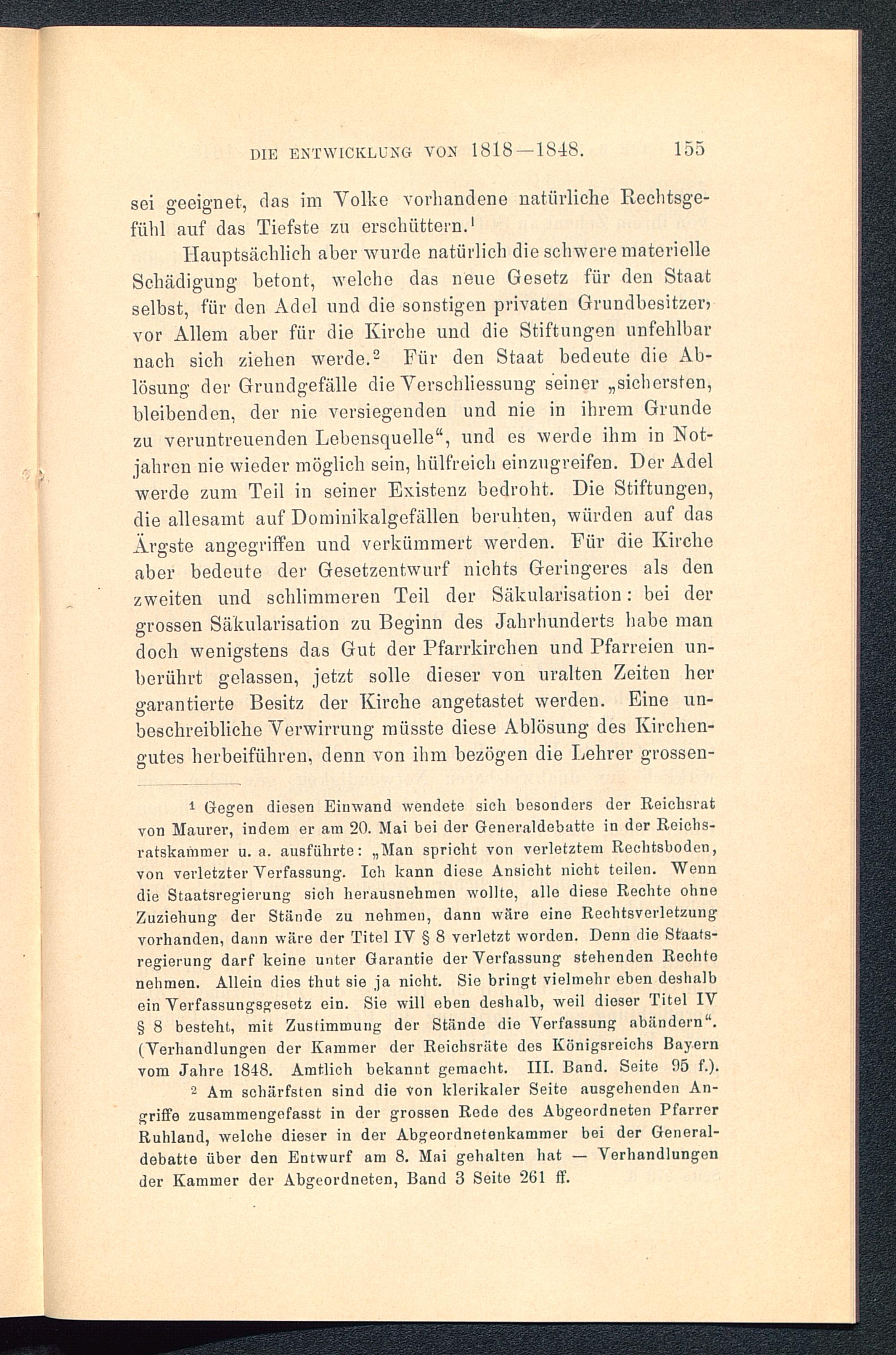 1 Gegen diesen Einwand wendete sich besonders der Reichsratvon Maurer, indem er am 20. Mai bei der Generaldebatte in der Reichs-ratskammer u. a. ausführte: „Man spricht von verletztem Rcehtsboden,von verletzter Verfassung. Ich kann diese Ansicht nicht teilen. Wenndie Staatsregierung sich herausnehmen wollte, alle diese Rechte ohneZuziehung der Stände zu nehmen, dann wäre eine Rechtsverletzungvorhanden, dann wäre der Titel IV § 8 verletzt worden. Denn die Staats-regierung darf keine unter Garantie der Verfassung stehenden Rechtonehmen. Allein dies thut sie ja nicht. Sie bringt vielmehr eben deshalbein Verfassungsgesetz ein. Sie will eben deshalb, weil dieser Titel IV§ 8 besteht, mit Zustimmung der Stände die Verfassung abändern“.(Verhandlungen der Kammer der Reichsräte des Königsreichs Bayernvom Jahre 1848. Amtlich bekannt gemacht. III. Band. Seite 95 f.).