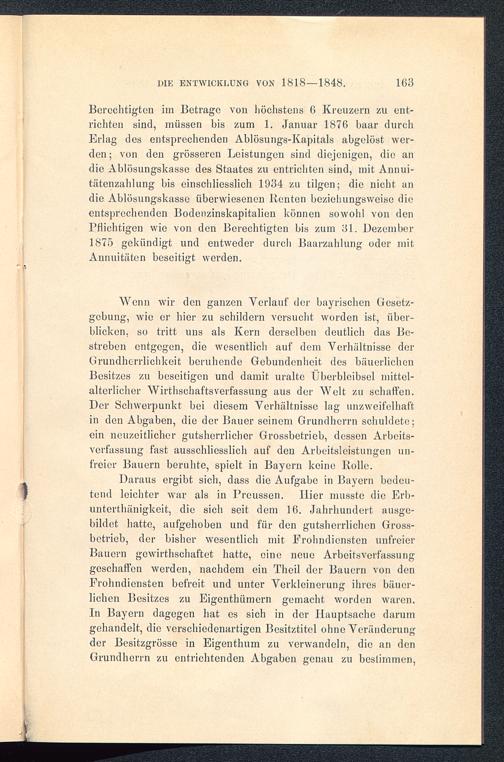 Wenn wir den ganzen Verlauf der bayrischen Gesetz-gebung, wie er hier zu schildern versucht worden ist, über-blicken, so tritt uns als Kern derselben deutlich das Be-streben entgegen, die wesentlich auf dem Verhältnisse derGrundherrlichkeit beruhende Gebundenheit des bäuerlichenBesitzes zu beseitigen und damit uralte Überbleibsel mittel-alterlicher Wirthschaftsverfassung aus der Welt zu schaffen.Der Schwerpunkt bei diesem Verhältnisse lag unzweifelhaftin den Abgaben, die der Bauer seinem Grundherrn schuldete;ein neuzeitlicher gutsherrlicher Grossbetrieb, dessen Arbeits-verfassung fast ausschliesslich auf den Arbeitsleistungen un-freier Bauern beruhte, spielt in Bayern keine Rolle.