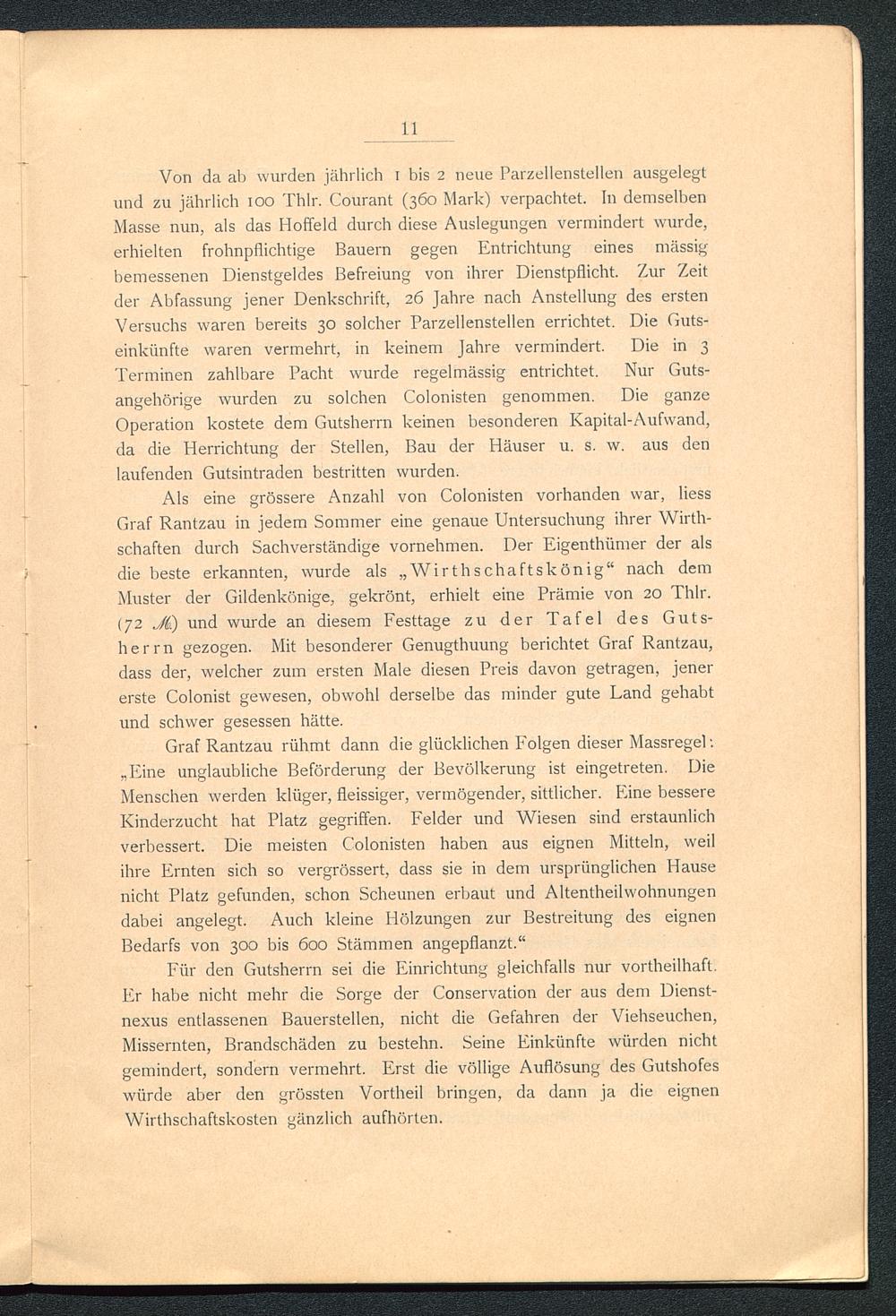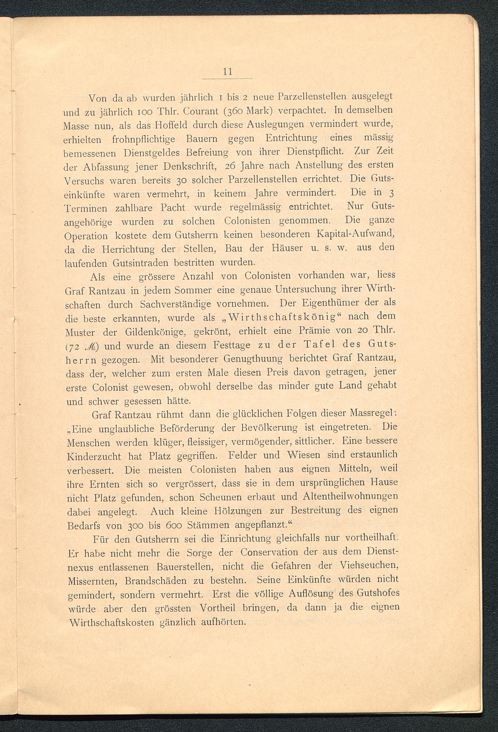 Graf Rantzau rühmt dann die glücklichen Folgen dieser Massregel:„Eine unglaubliche Beförderung der Bevölkerung ist eingetreten. DieMenschen werden klüger, fleissiger, vermögender, sittlicher. Eine bessereKinderzucht hat Platz gegriffen. Felder und Wiesen sind erstaunlichverbessert. Die meisten Colonisten haben aus eignen Mitteln, weilihre Ernten sich so vergrössert, dass sie in dem ursprünglichen Hausenicht Platz gefunden, schon Scheunen erbaut und Altentheilwohnungendabei angelegt. Auch kleine Holzungen zur Bestreitung des eignenBedarfs von 300 bis 600 Stämmen angepflanzt."