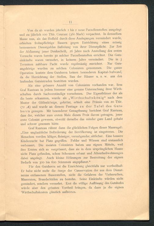 Als eine grössere Anzahl von Colonisten vorhanden war, HessGraf Rantzau in jedem Sommer eine genaue Untersuchung ihrer Wirth-schaften durch Sachverständige vornehmen. Der Eigenthümer der alsdie beste erkannten, wurde als „WirthSchaftskönig" nach demMuster der Gildenkönige, gekrönt, erhielt eine Prämie von 20 Thlr.(72 J£) und wurde an diesem Festtage zu der Tafel des Guts-herrn gezogen. Mit besonderer Genugthuung berichtet Graf Rantzau,dass der, welcher zum ersten Male diesen Preis davon getragen, jenererste Colonist gewesen, obwohl derselbe das minder gute Land gehabtund schwer gesessen hätte.
