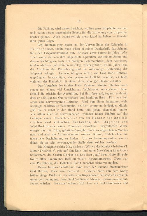 Graf Rantzau ging später zu der Verwandlung der Zeitpacht inErbpacht über, theilte auch schon in seiner Denkschrift das Schemafür einen Erbpachtskontrakt mit. Er starb zwar bereits im Jahre 1769.Doch wurde die von ihm eingeleitete Operation von seinem Sohne unddessen Nachfolgern, trotz des häufigen Besitzwechsels, dem Ascheberg in den nächsten Jahrzehnten unterlag, weiter geführt, bis im Jahre 1794der Abschluss der Parzellirung und die vollständige Einführung derErbpacht erfolgte. Es war übrigens nicht, wie Graf Hans Rantzauursprünglich beabsichtigte, das gesammte Hoffeld parzellirt, es bliebvielmehr der Haupthof mit einem Areal von 370 Hektar erhalten.