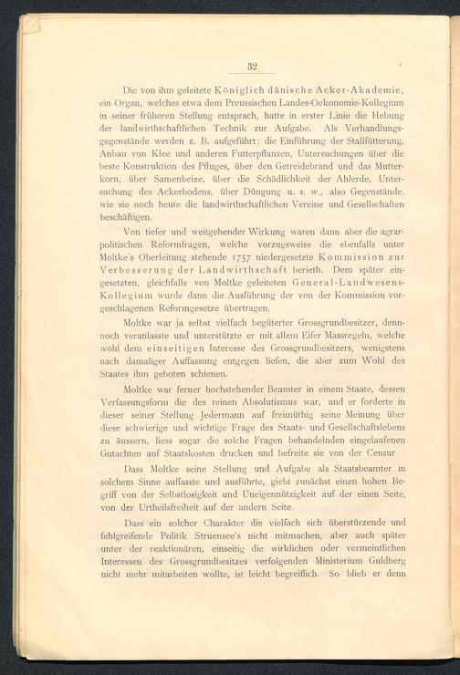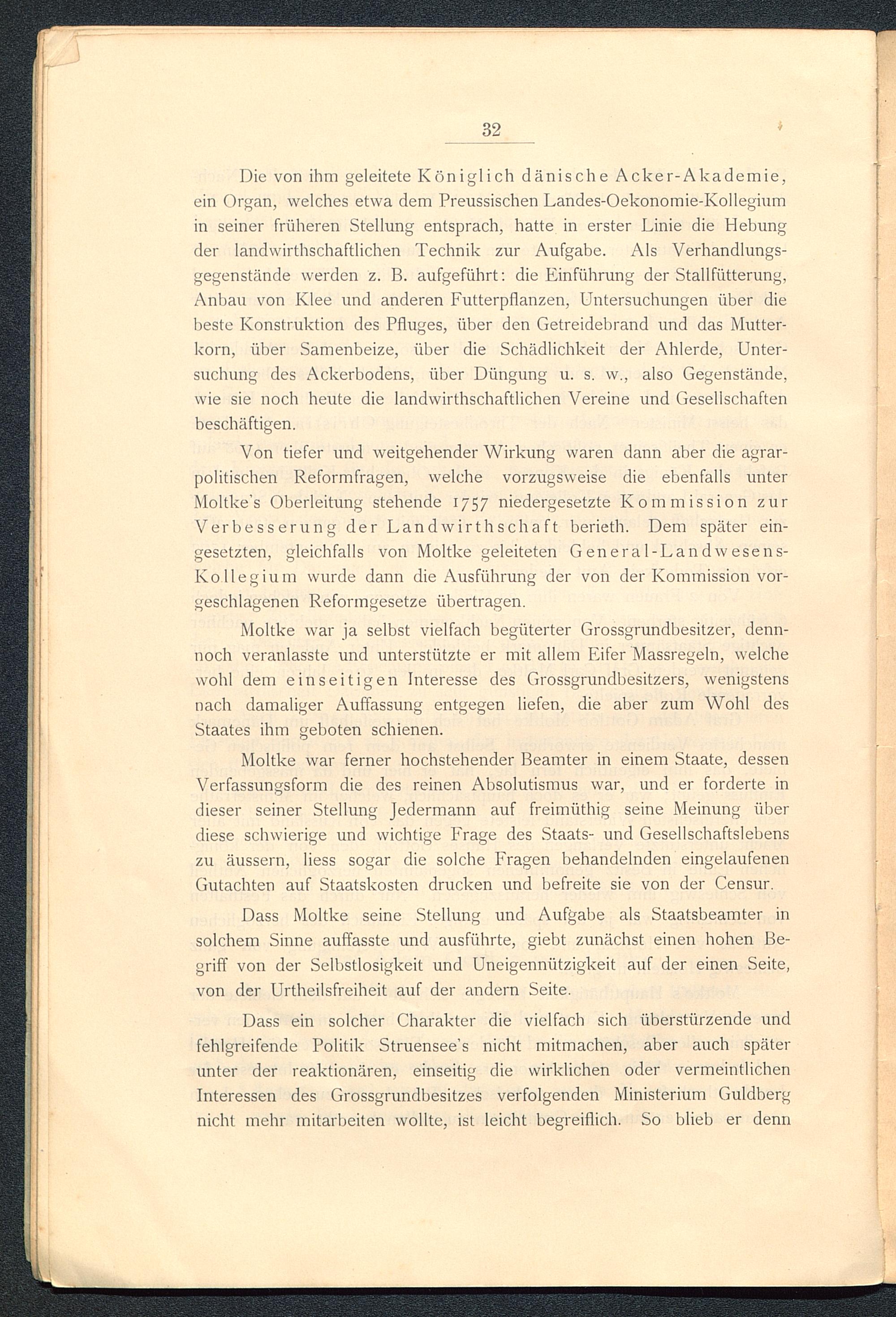 Moltke war ja selbst vielfach begüterter Grossgrundbesitzer, denn-noch veranlasste und unterstützte er mit allem Eifer Massregeln, welchewohl dem einseitigen Interesse des Grossgrundbesitzers, wenigstensnach damaliger Auffassung entgegen liefen, die aber zum Wohl desStaates ihm geboten schienen.