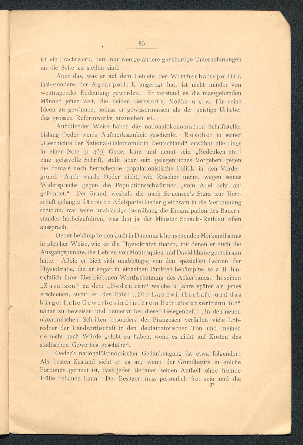 Auffallender Weise haben die nationalökonomischen Schriftstellerbislang Oeder wenig Aufmerksamkeit geschenkt. Roscher in seiner„Geschichte der National-Oekonomik in Deutschland" erwähnt allerdingsin einer Note (p. 469) Oeder kurz und nennt sein „Bedenken etc."eine geistvolle Schrift, stellt aber sein gelegentliches Vorgehen gegendie damals noch herrschende populationistische Politik in den Vorder-grund. Auch wurde Oeder nicht, wie Roscher meint, wegen seinesWiderspruchs gegen die Populationsschwärmer „vom Adel sehr an-gefeindet." Der Grund, weshalb die nach Struensee's Sturz zur Herr-schaft gelangte dänische Adelspartei Oeder gleichsam in die Verbannungschickte, war seine unablässige Bemühung die Emanzipation des Bauern-standes herbeizuführen, was ihm ja der Minister Schack-Rathlau offenaussprach.