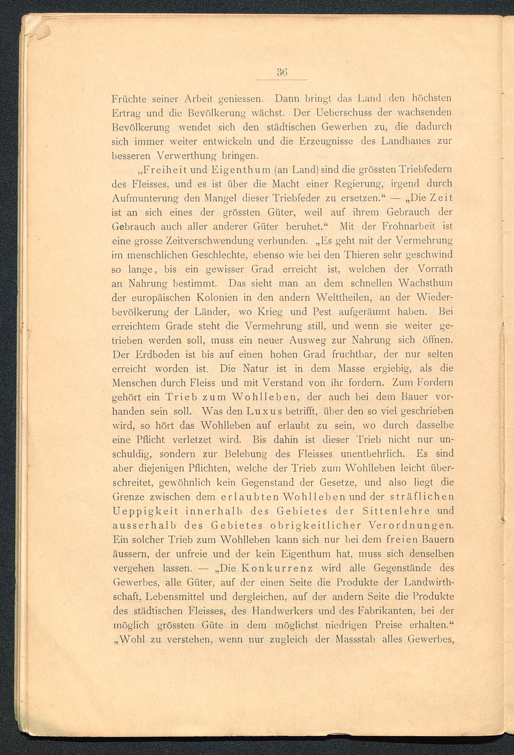 Früchte seiner Arbeit geniessen. Dann bringt das Land den höchstenErtrag und die Bevölkerung wächst. Der Ueberschuss der wachsendenBevölkerung wendet sich den städtischen Gewerben zu, die dadurchsich immer weiter entwickeln und die Erzeugnisse des Landbaues zurbesseren Verwerthung bringen.