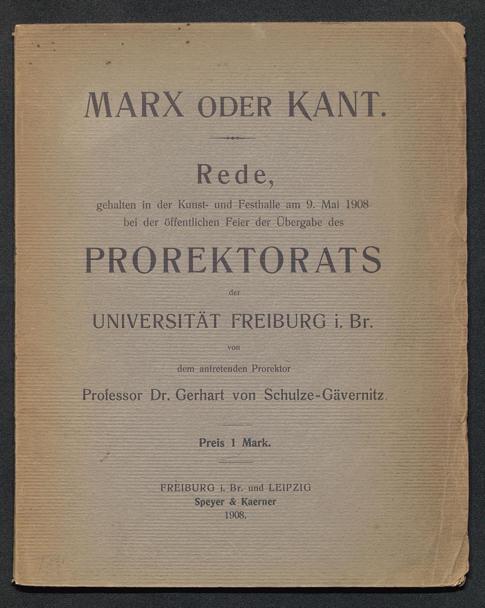 MARX ODER KANT.Rede,gehalten in der Kunst- und Festhalle am 9. Mai 1908bei der öffentlichen Feier der Übergabe desPROREKTORATSderUNIVERSITÄT FREIBURG i. Br.dem antretenden ProrektorProfessor Dr. Gerhart von Schulze-Gävernitz,Preis 1 Mark.FREIBURG i. Br. und LEIPZIG Speyer & Kaerner