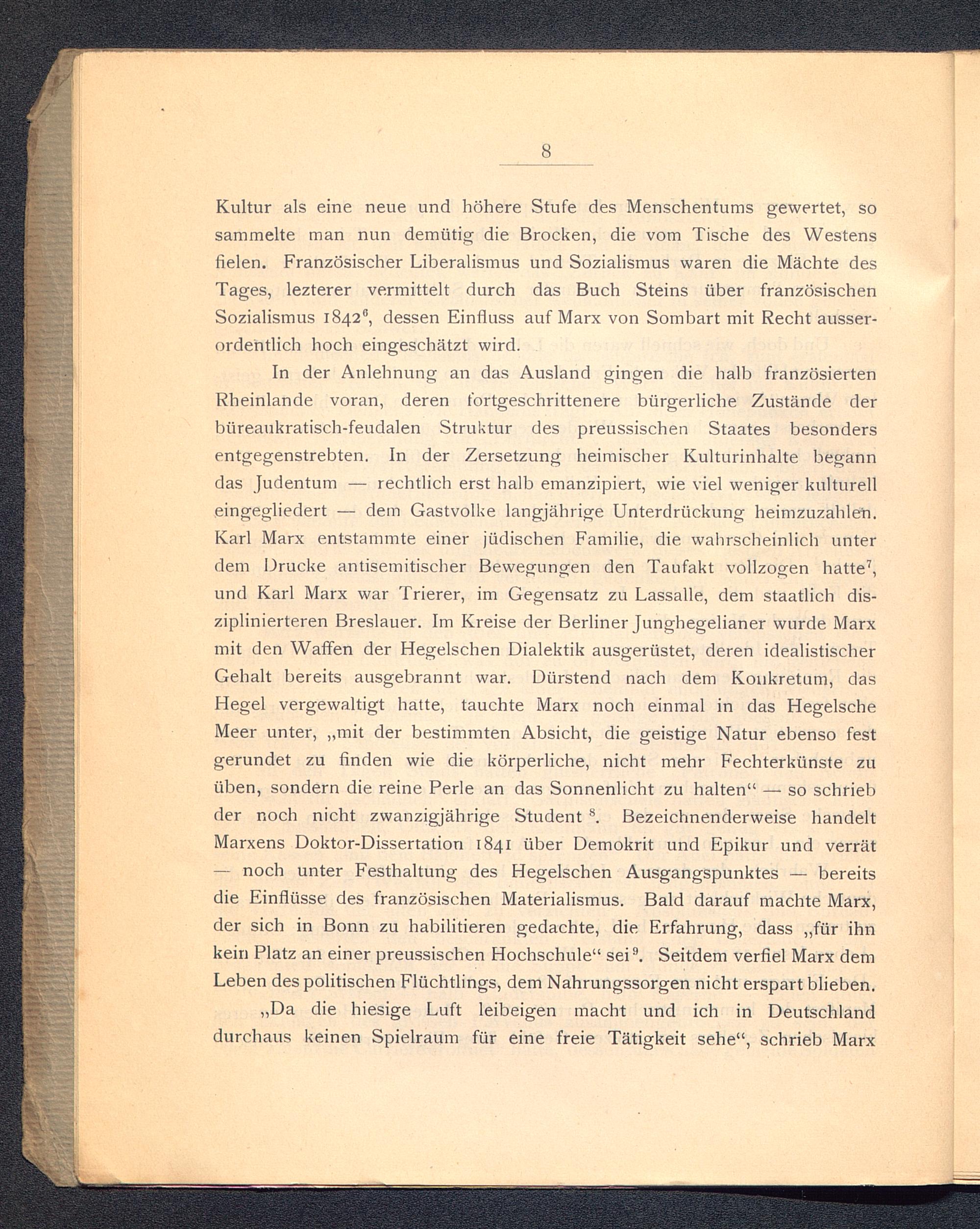 Kultur als eine neue und höhere Stufe des Menschentums gewertet, sosammelte man nun demütig die Brocken, die vom Tische des Westensfielen. Französischer Liberalismus und Sozialismus waren die Mächte desTages, lezterer vermittelt durch das Buch Steins über französischen Sozialismus 1842°, dessen Einfluss auf Marx von Sombart mit Recht ausser-ordentlich hoch eingeschätzt wird.