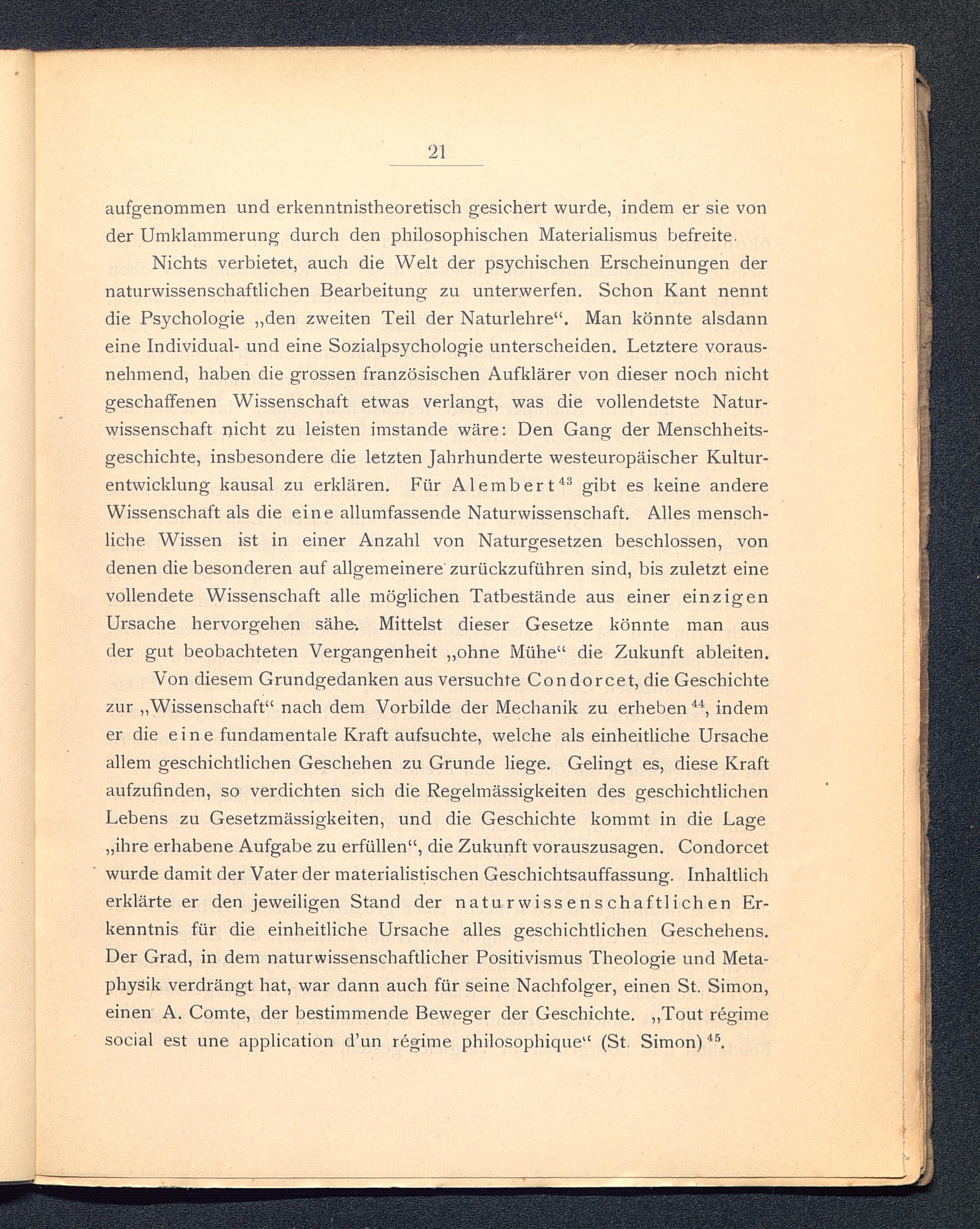 Von diesem Grundgedanken aus versuchte Condorcet, die Geschichtezur „Wissenschaft“ nach dem Vorbilde der Mechanik zu erheben 44 , indemer die eine fundamentale Kraft aufsuchte, welche als einheitliche Ursacheallem geschichtlichen Geschehen zu Grunde liege. Gelingt es, diese Kraftaufzufinden, so verdichten sich die Regelmässigkeiten des geschichtlichenLebens zu Gesetzmässigkeiten, und die Geschichte kommt in die Lage„ihre erhabene Aufgabe zu erfüllen“, die Zukunft vorauszusagen. Condorcet wurde damit der Vater der materialistischen Geschichtsauffassung. Inhaltlicherklärte er den jeweiligen Stand der naturwissenschaftlichen Er-kenntnis für die einheitliche Ursache alles geschichtlichen Geschehens.Der Grad, in dem naturwissenschaftlicher Positivismus Theologie und Meta-physik verdrängt hat, war dann auch für seine Nachfolger, einen St. Simon ,einen A. Comte , der bestimmende Beweger der Geschichte. „Tout regimesocial est une application d’un regime philosophique“ (St. Simon ) 45 .