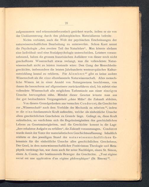 Nichts verbietet, auch die Welt der psychischen Erscheinungen dernaturwissenschaftlichen Bearbeitung zu unterwerfen. Schon Kant nenntdie Psychologie „den zweiten Teil der Naturlehre“. Man könnte alsdanneine Individual- und eine Sozialpsychologie unterscheiden. Letztere voraus-nehmend, haben die grossen französischen Aufklärer von dieser noch nichtgeschaffenen Wissenschaft etwas verlangt, was die vollendetste Natur-wissenschaft nicht zu leisten imstande wäre: Den Gang der Menschheits-geschichte, insbesondere die letzten Jahrhunderte westeuropäischer Kultur-entwicklung kausal zu erklären. Für Alembert 43 gibt es keine andereWissenschaft als die eine allumfassende Naturwissenschaft. Alles mensch-liche Wissen ist in einer Anzahl von Naturgesetzen beschlossen, vondenen die besonderen auf allgemeinere zurückzuführen sind, bis zuletzt einevollendete Wissenschaft alle möglichen Tatbestände aus einer einzigenUrsache hervorgehen sähe-. Mittelst dieser Gesetze könnte man ausder gut beobachteten Vergangenheit „ohne Mühe“ die Zukunft ableiten.