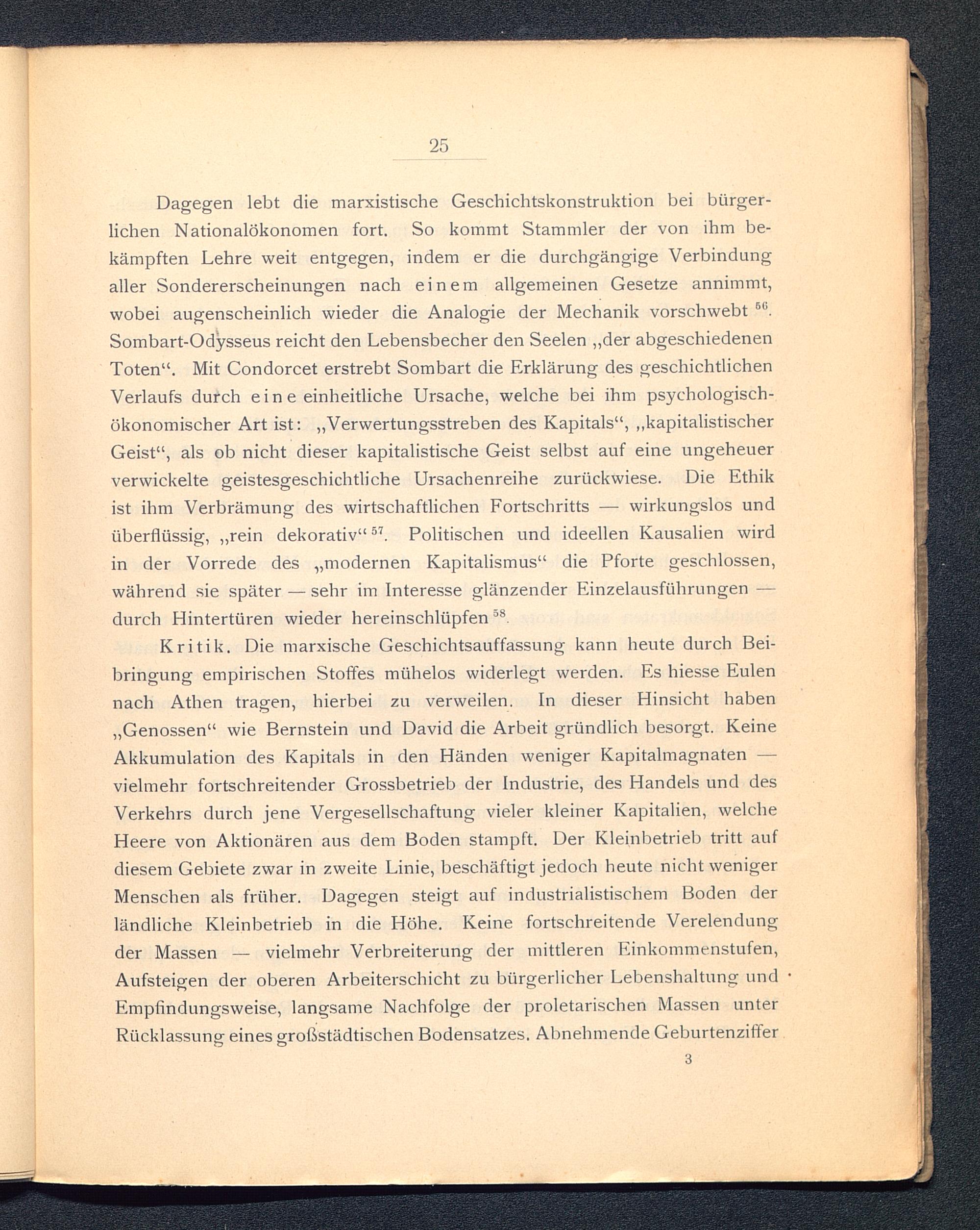 Dagegen lebt die marxistische Geschichtskonstruktion bei bürger-lichen Nationalökonomen fort. So kommt Stammler der von ihm be-kämpften Lehre weit entgegen, indem er die durchgängige Verbindungaller Sondererscheinungen nach einem allgemeinen Gesetze annimmt,wobei augenscheinlich wieder die Analogie der Mechanik vorschwebt 6Ü .Sombart-Odysseus reicht den Lebensbecher den Seelen „der abgeschiedenenToten“. Mit Condorcet erstrebt Sombart die Erklärung des geschichtlichenVerlaufs durch e i n e einheitliche Ursache, welche bei ihm psychologisch-ökonomischer Art ist: „Verwertungsstreben des Kapitals“, „kapitalistischerGeist“, als ob nicht dieser kapitalistische Geist selbst auf eine ungeheuerverwickelte geistesgeschichtliche Ursachenreihe zurückwiese. Die Ethikist ihm Verbrämung des wirtschaftlichen Fortschritts — wirkungslos undüberflüssig, „rein dekorativ“ 57 . Politischen und ideellen Kausalien wirdin der Vorrede des „modernen Kapitalismus“ die Pforte geschlossen,während sie später — sehr im Interesse glänzender Einzelausführungen —durch Hintertüren wieder hereinschlüpfen 38