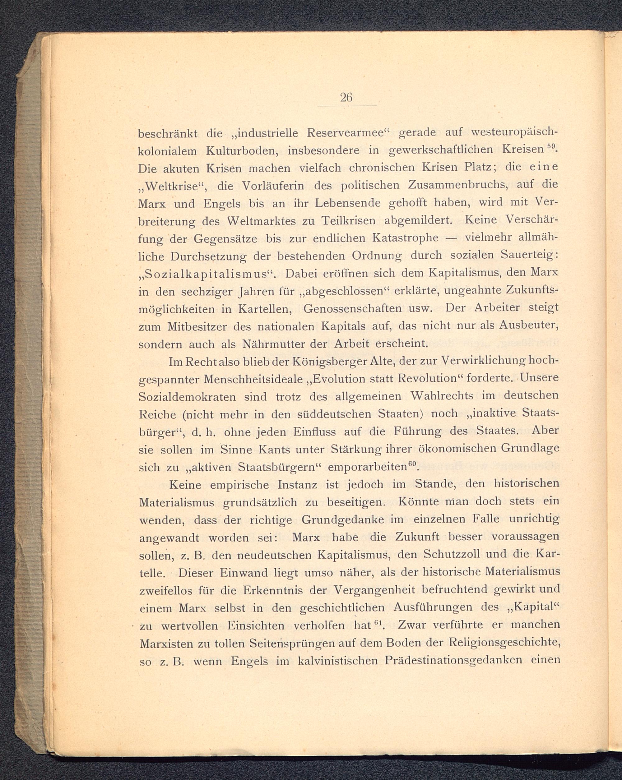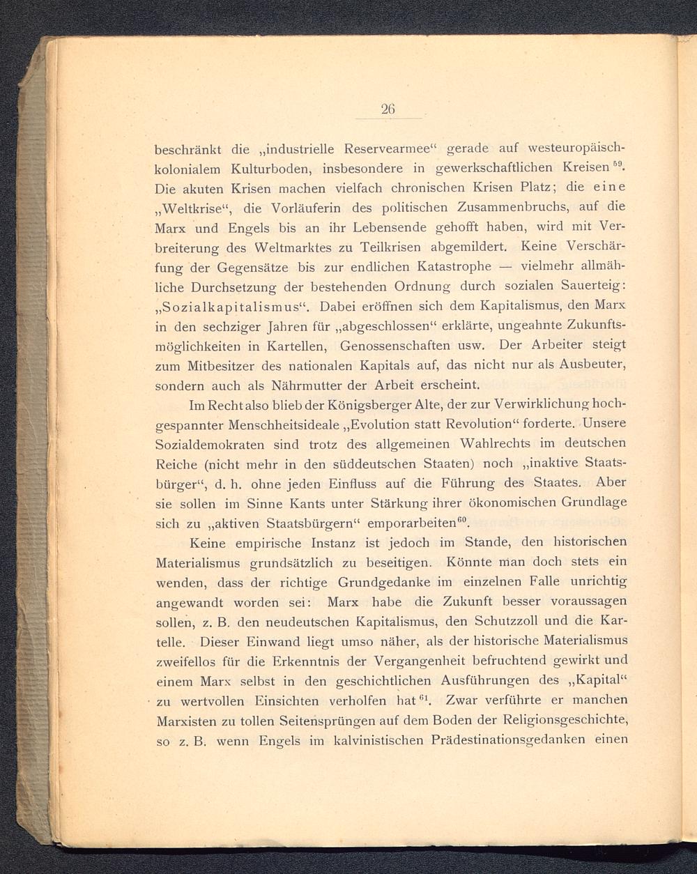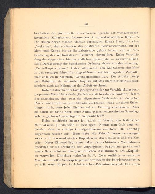 sollen, z. B. den neudeutschen Kapitalismus, den Schutzzoll und die Kar-telle. Dieser Einwand liegt umso näher, als der historische Materialismuszweifellos für die Erkenntnis der Vergangenheit befruchtend gewirkt undeinem Marx selbst in den geschichtlichen Ausführungen des „Kapital“zu wertvollen Einsichten verholfen hat 01 . Zwar verführte er manchenMarxisten zu tollen Seitensprüngen auf dem Boden der Religionsgeschichte,so z. B. wenn Engels im kalvinistischen Prädestinationsgedanken einen