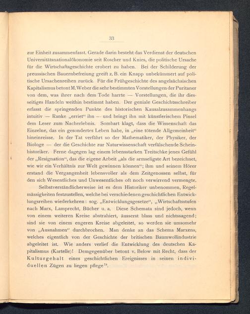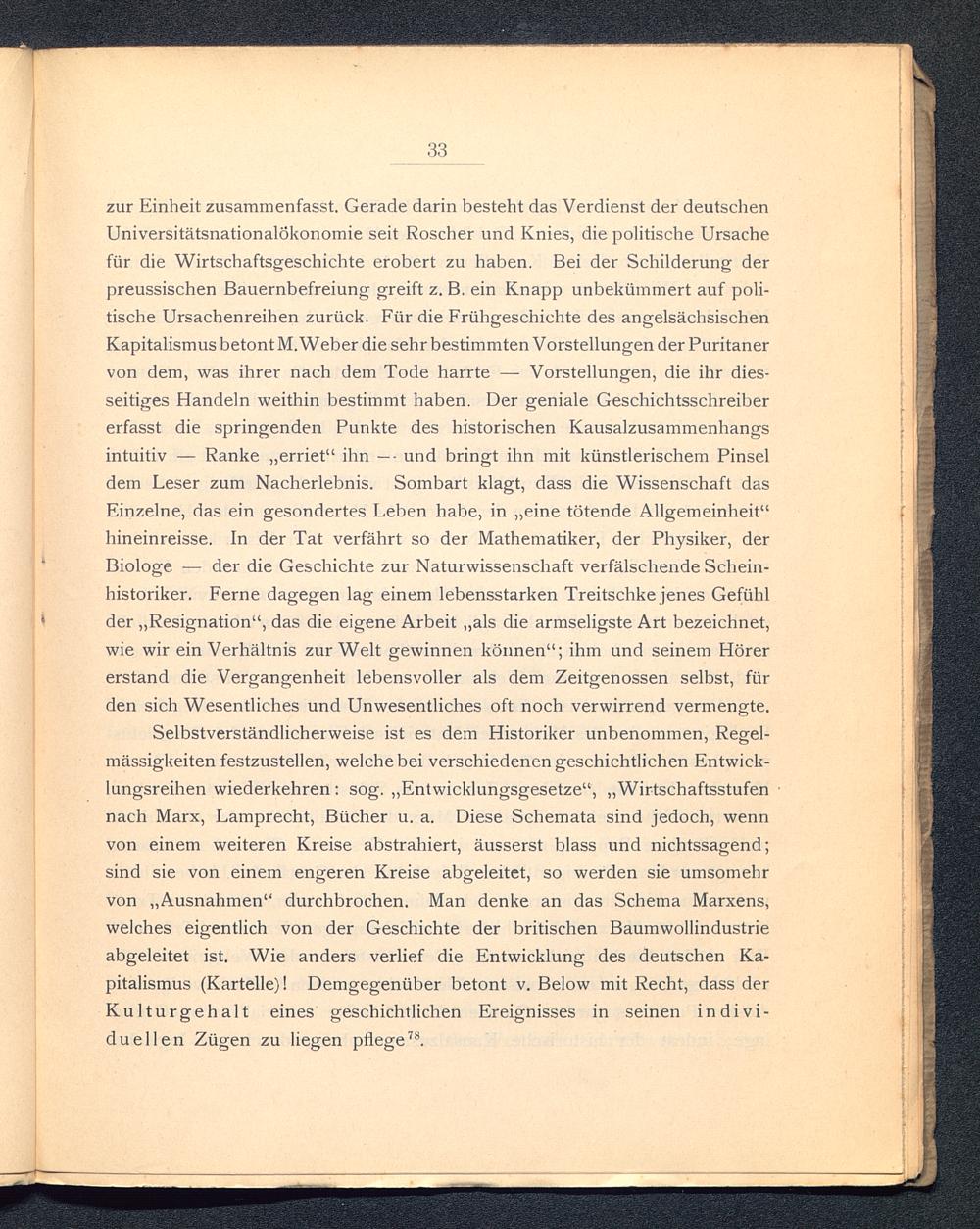 Selbstverständlicherweise ist es dem Historiker unbenommen, Regel-mässigkeiten festzustellen, welche bei verschiedenen geschichtlichen Entwick-lungsreihen wiederkehren: sog. „Entwicklungsgesetze“, „Wirtschaftsstufennach Marx, Lamprecht, Bücher u. a. Diese Schemata sind jedoch, wennvon einem weiteren Kreise abstrahiert, äusserst blass und nichtssagend;sind sie von einem engeren Kreise abgeleitet, so werden sie umsomehrvon „Ausnahmen“ durchbrochen. Man denke an das Schema Marxens,welches eigentlich von der Geschichte der britischen Baumwollindustrieabgeleitet ist. Wie anders verlief die Entwicklung des deutschen Ka-pitalismus (Kartelle)! Demgegenüber betont v. Below mit Recht, dass derKulturgehalt eines geschichtlichen Ereignisses in seinen indivi-duellen Zügen zu liegen pflege 78 .