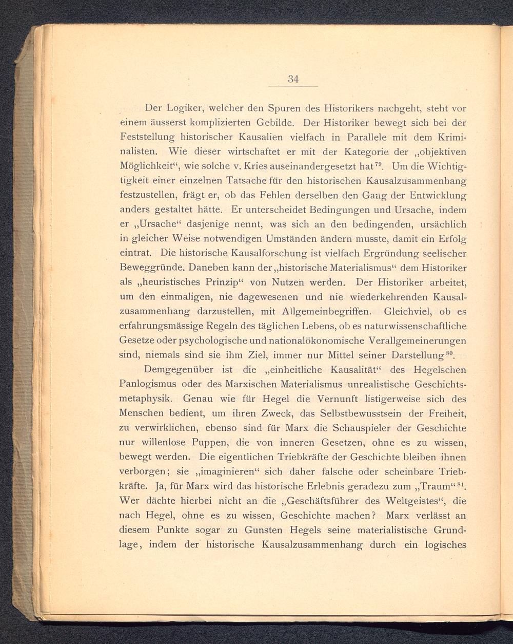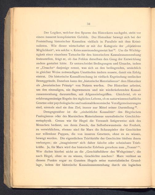 Der Logiker, welcher den Spuren des Historikers nachgeht, steht voreinem äusserst komplizierten Gebilde. Der Historiker bewegt sich bei derFeststellung historischer Kausalien vielfach in Parallele mit dem Krimi-nalisten. Wie dieser wirtschaftet er mit der Kategorie der ,,objektivenMöglichkeit“, wie solche v. Kries auseinandergesetzt hat 79 . Um die Wichtig-tigkeit einer einzelnen Tatsache für den historischen Kausalzusammenhangfestzustellen, frägt er, ob das Fehlen derselben den Gang der Entwicklunganders gestaltet hätte. Er unterscheidet Bedingungen und Ursache, indemer „Ursache“ dasjenige nennt, was sich an den bedingenden, ursächlichin gleicher Weise notwendigen Umständen ändern musste, damit ein Erfolgeintrat. Die historische Kausalforschung ist vielfach Ergründung seelischerBeweggründe. Daneben kann der „historische Materialismus“ dem Historikerals „heuristisches Prinzip“ von Nutzen werden. Der Historiker arbeitet,um den einmaligen, nie dagewesenen und nie wiederkehrenden Kausal-zusammenhang darzustellen, mit AUgemeinbegriffen. Gleichviel, ob eserfahrungsmässige Regeln des täglichen Lebens, ob es naturwissenschaftlicheGesetze oder psychologische und nationalökonomische Verallgemeinerungensind, niemals sind sie ihm Ziel, immer nur Mittel seiner Darstellung 80 .