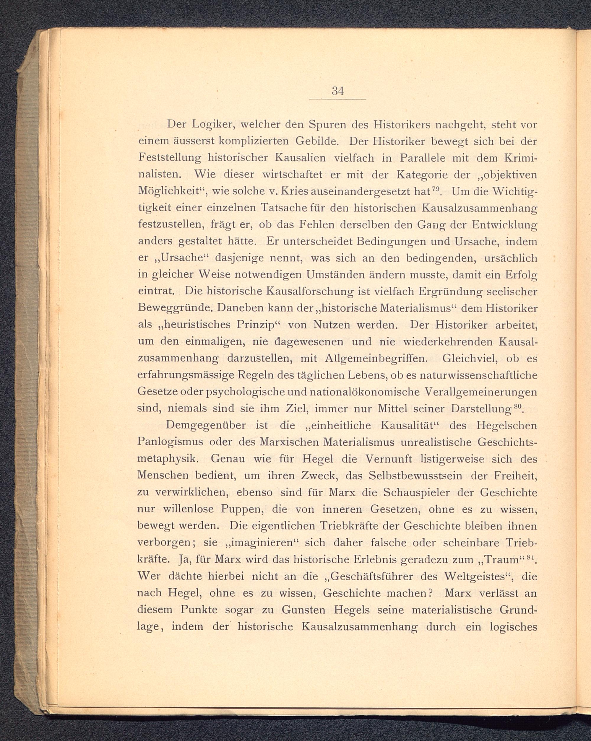 Demgegenüber ist die „einheitliche Kausalität“ des Hegelschen Panlogismus oder des Marxischen Materialismus unrealistische Geschichts-metaphysik. Genau wie für Hegel die Vernunft listigerweise sich desMenschen bedient, um ihren Zweck, das Selbstbewusstsein der Freiheit,zu verwirklichen, ebenso sind für Marx die Schauspieler der Geschichtenur willenlose Puppen, die von inneren Gesetzen, ohne es zu wissen,bewegt werden. Die eigentlichen Triebkräfte der Geschichte bleiben ihnenverborgen; sie „imaginieren“ sich daher falsche oder scheinbare Trieb-kräfte. Ja, für Marx wird das historische Erlebnis geradezu zum „Traum“ 81 .Wer dächte hierbei nicht an die „Geschäftsführer des Weltgeistes“, dienach Hegel, ohne es zu wissen, Geschichte machen? Marx verlässt andiesem Punkte sogar zu Gunsten Hegels seine materialistische Grund-lage, indem der historische Kausalzusammenhang durch ein logisches